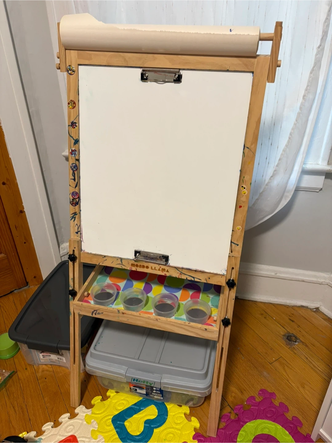 Mondo Llama art easel for kids! It features a whiteboard on one side and a chalkboard on the other. It also has a paper roll at the top for painting and drawing. The easel includes a tray for holding paint cups and supplies.