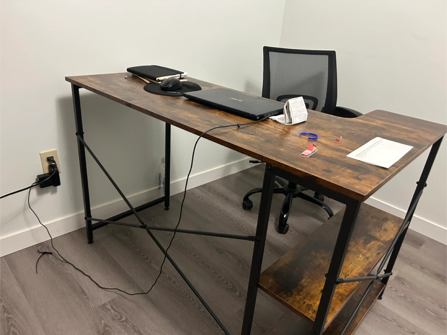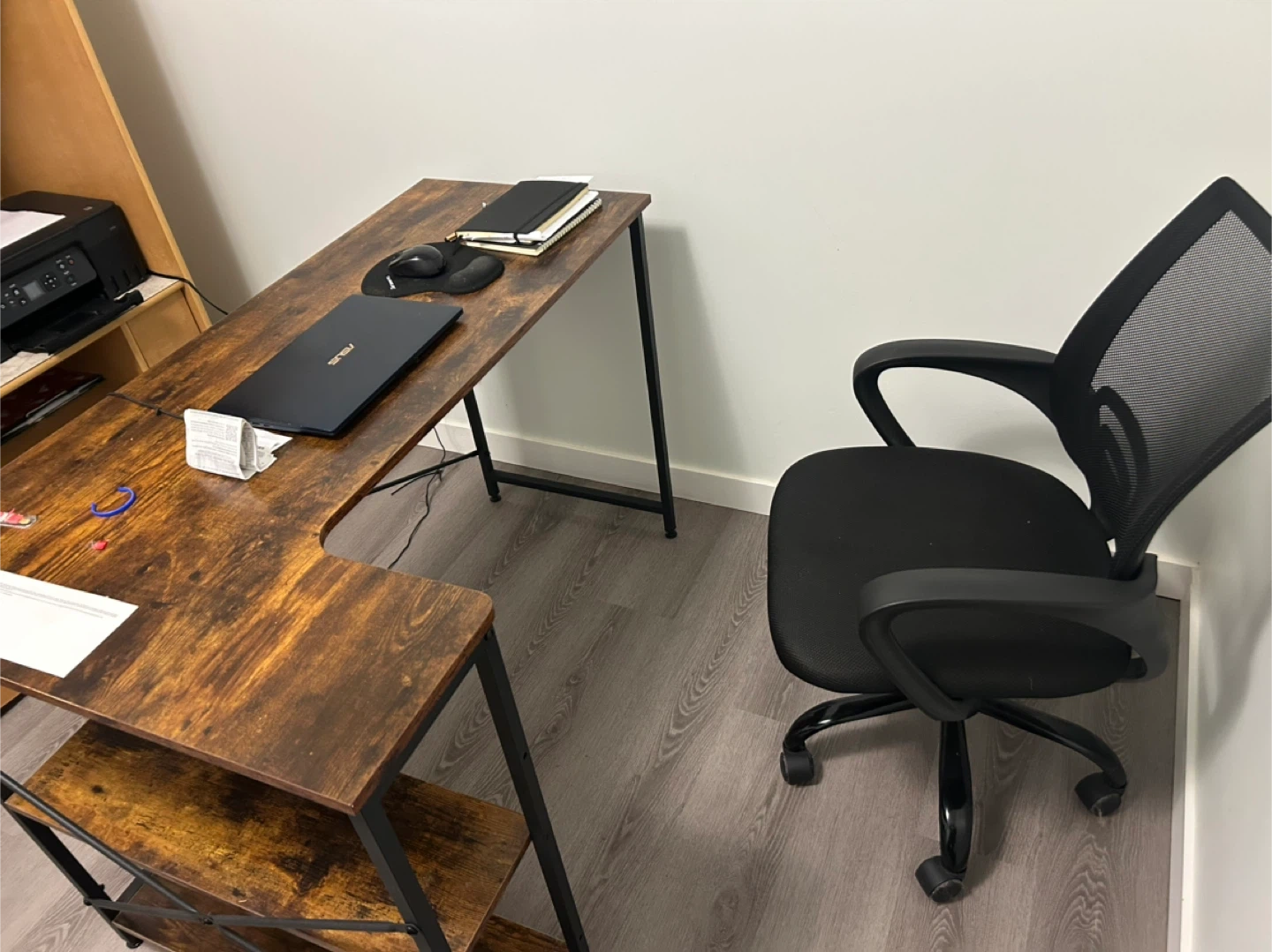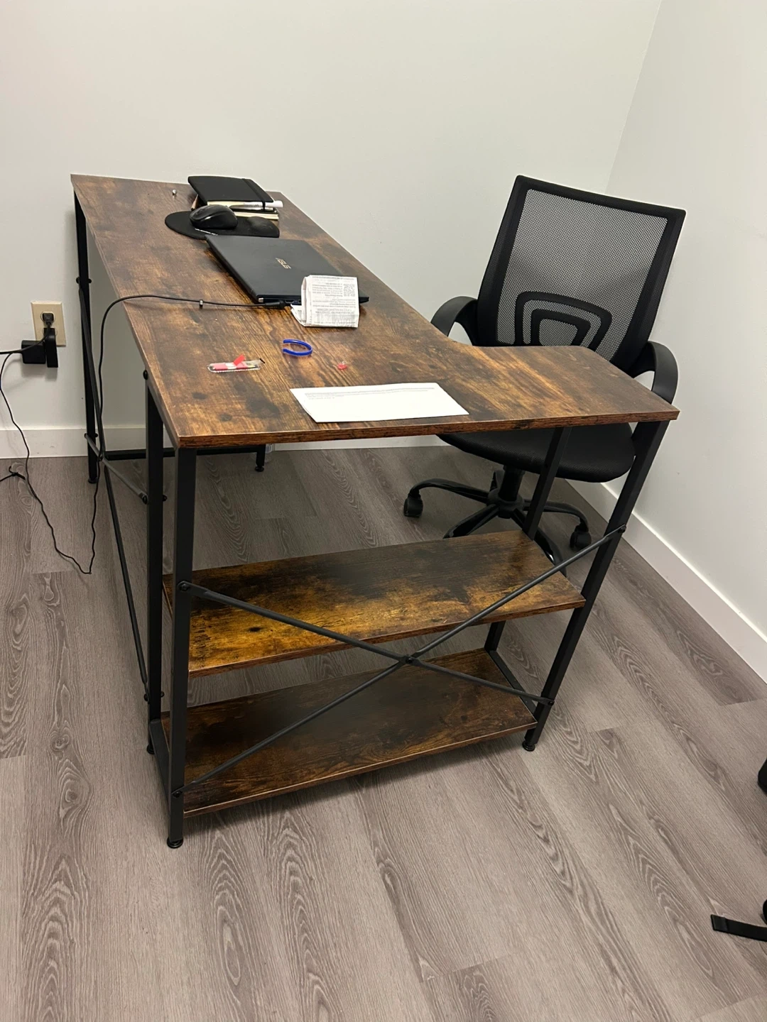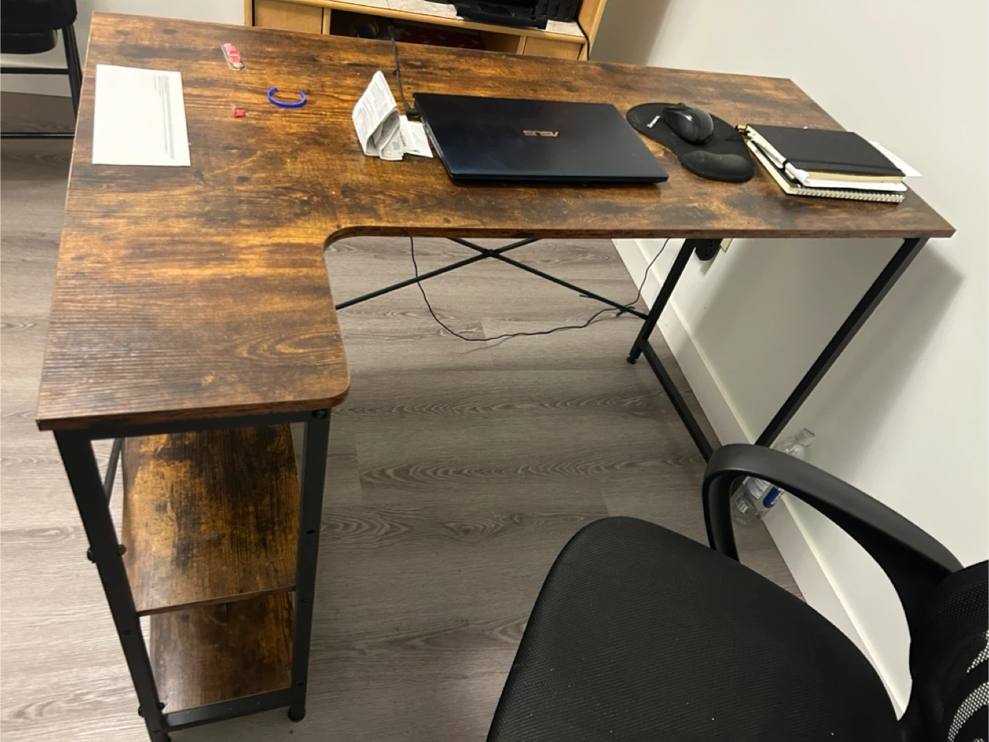Selling a vintage brown L-shaped computer desk featuring built-in 2 shelves! Perfect for a home office or study space, providing ample room for your computer and other essentials. The shelves offer extra storage for books or decor. This desk is in great condition and ready for a new home! 47 in x 55 in