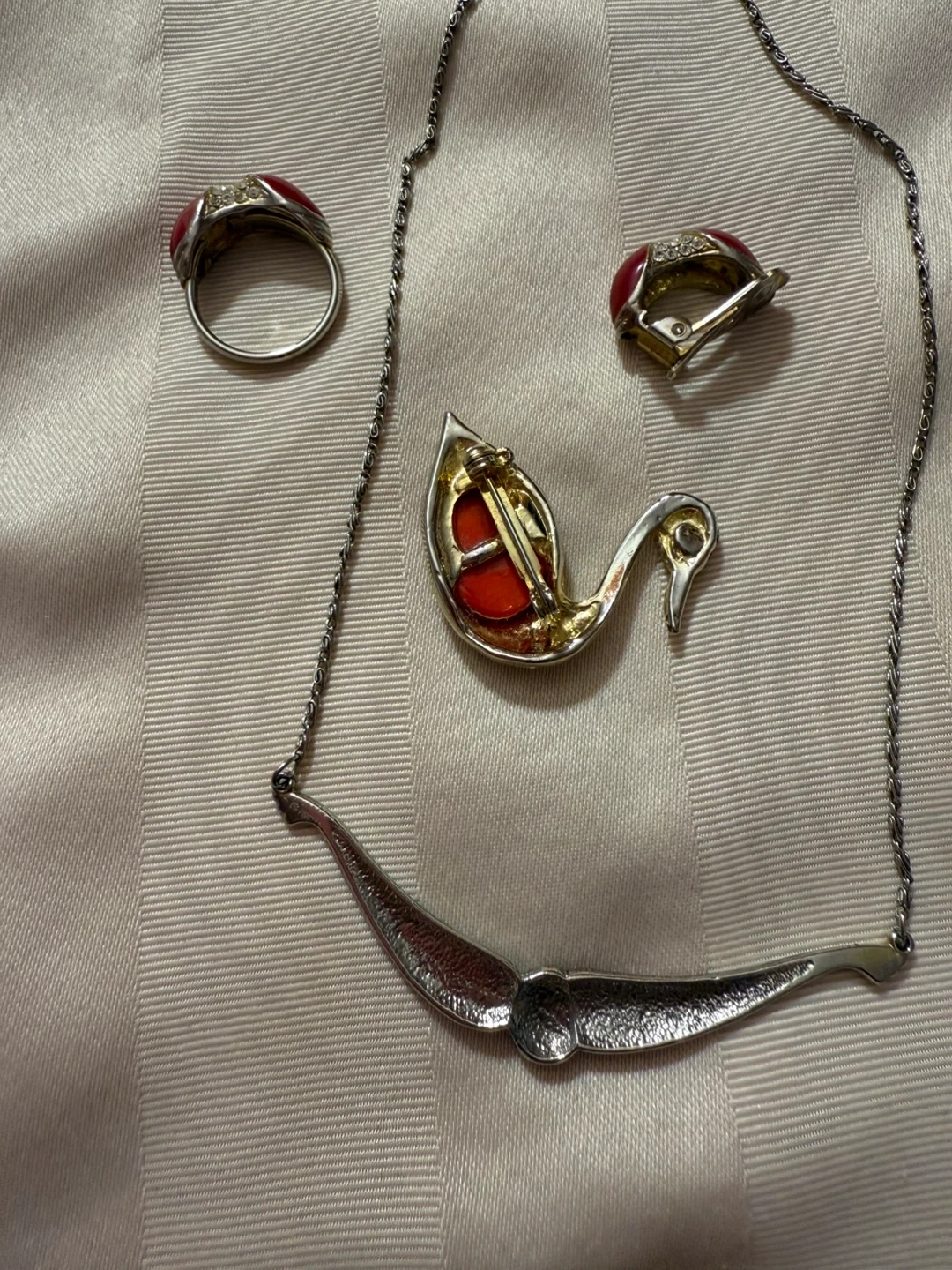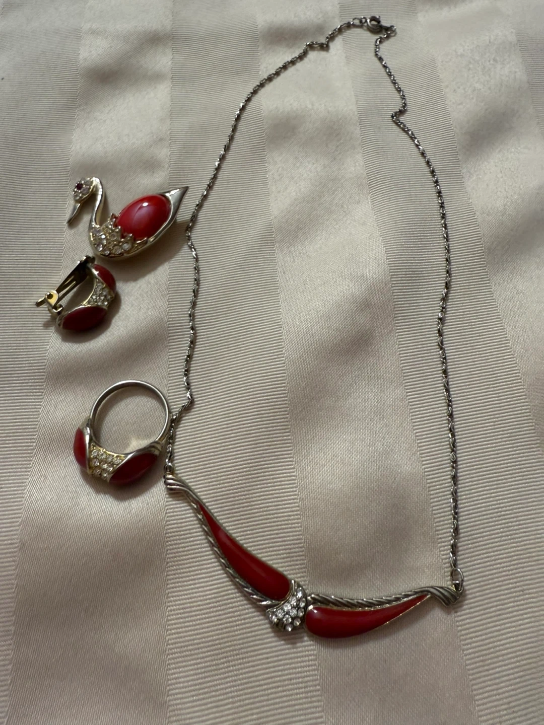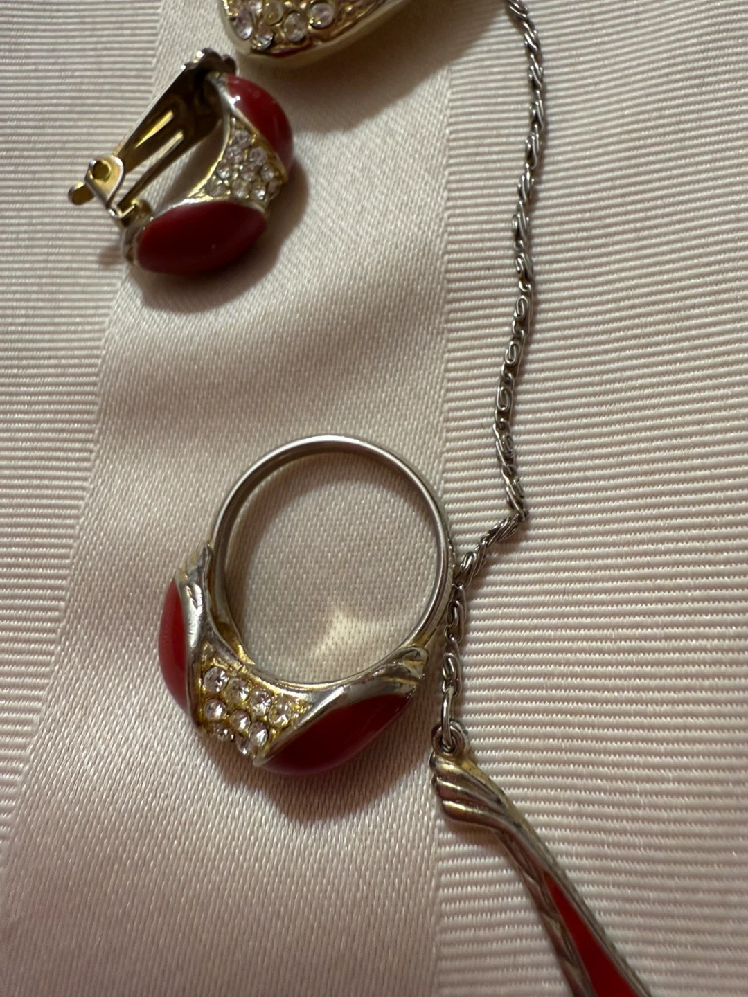 $15 for set Vintage jewelry set featuring a necklace, ring, and clip-on earrings. The set has a red and silver tone colour scheme. The necklace has a unique design with a central red accent. The ring and earrings also have matching red accents and rhinestone details. Perfect for adding a touch of vintage charm to any outfit!