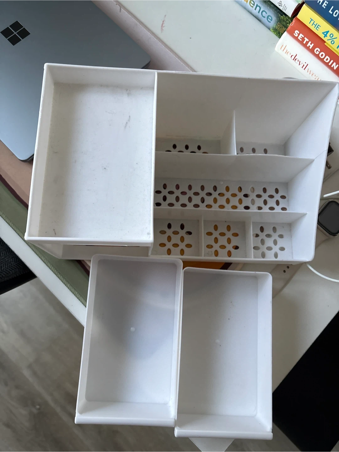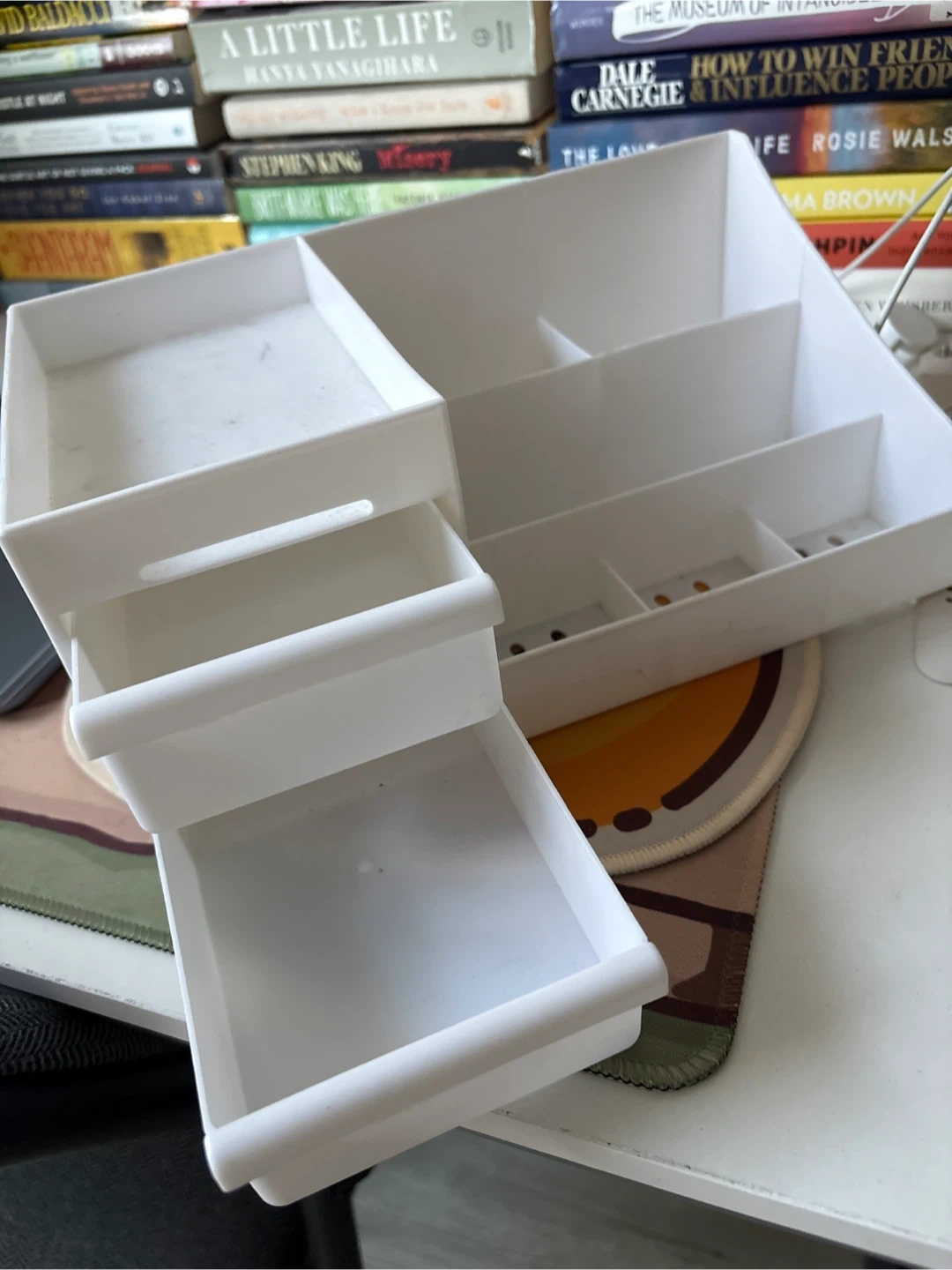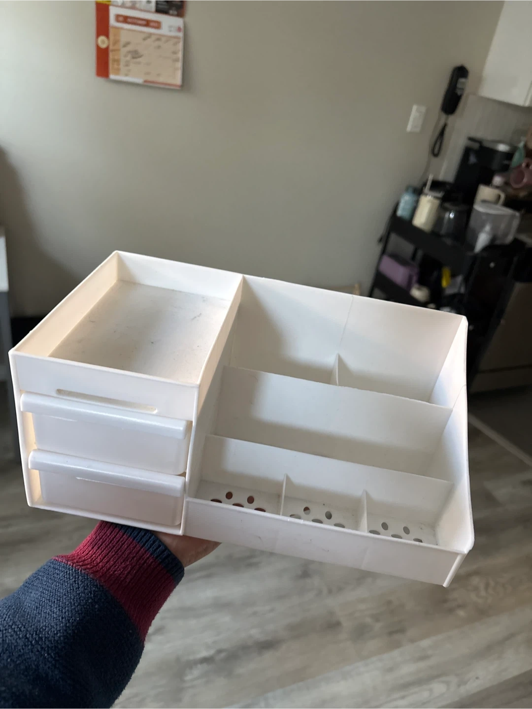 Declutter your space with this handy white desk organizer! It features multiple compartments and two drawers, perfect for keeping your stationery, cosmetics, or other small items neatly arranged. It's in great condition and ready for a new home. Will clean it before pickup :)