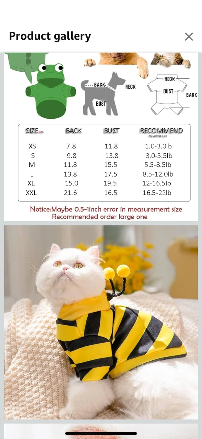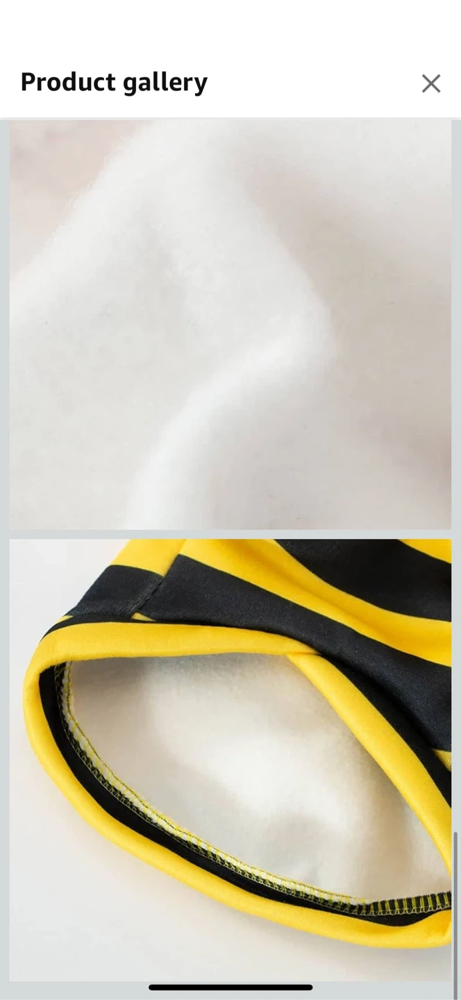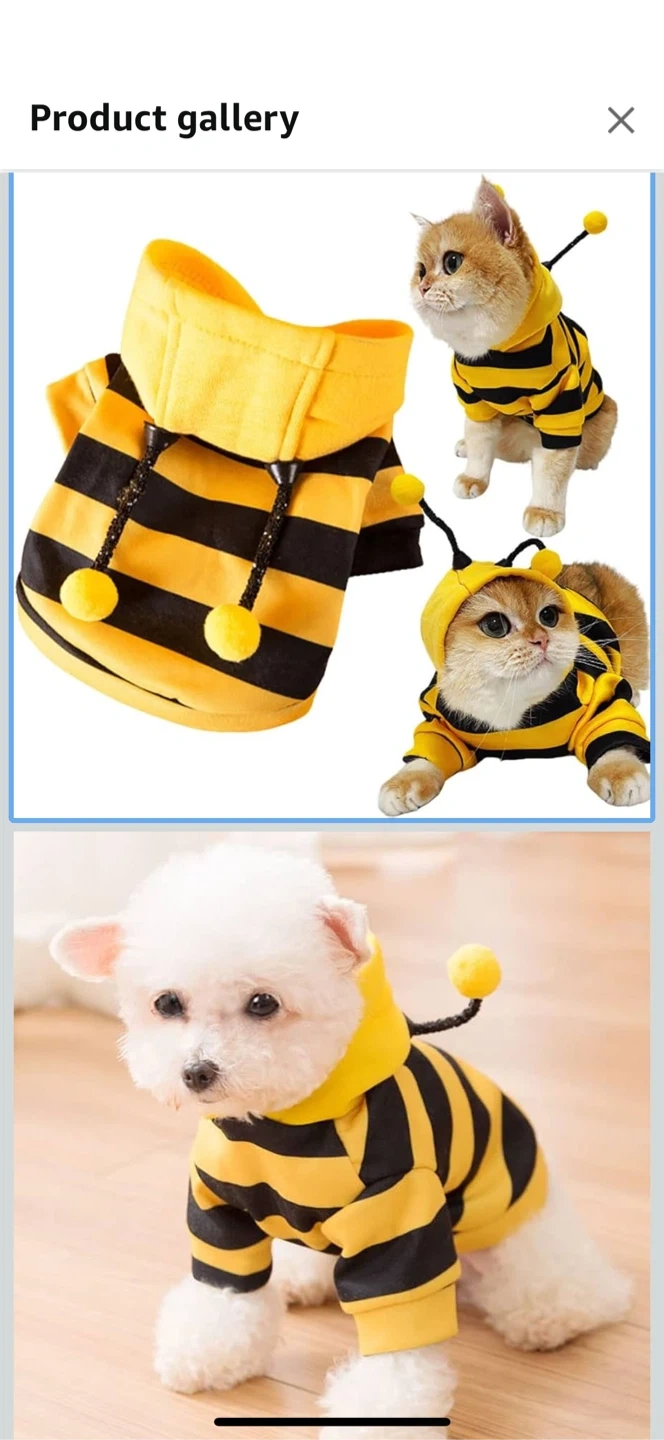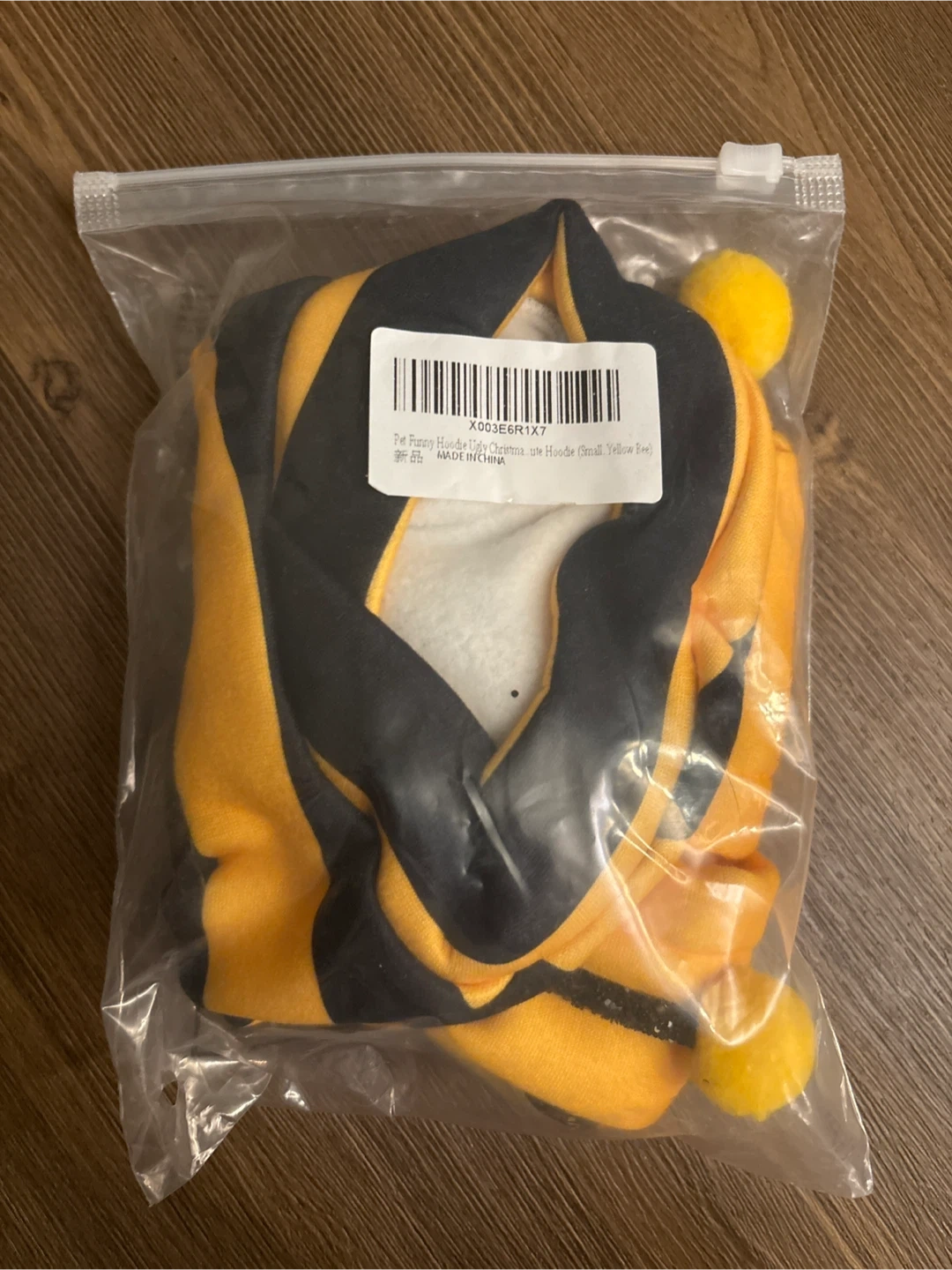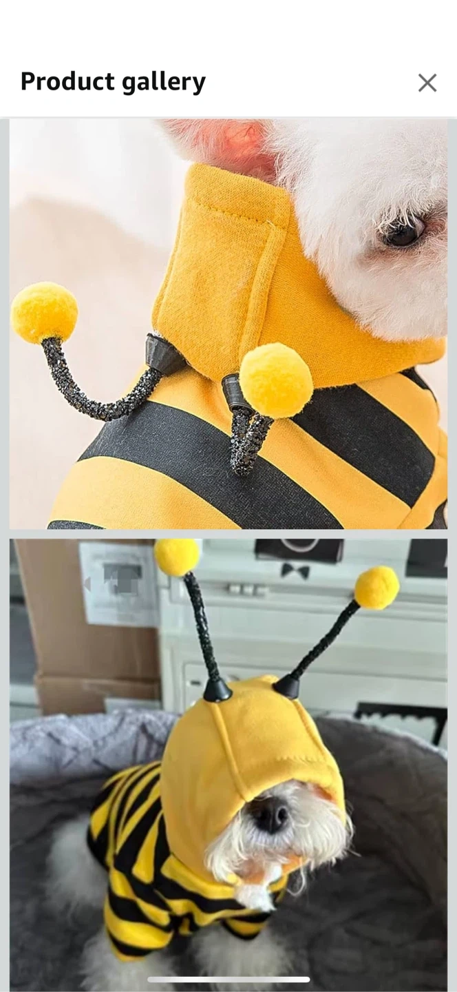 This is a brand new, adorable bee costume hoodie, perfect for your small dog or cat! It's yellow and black striped with cute little antennae and pom poms.