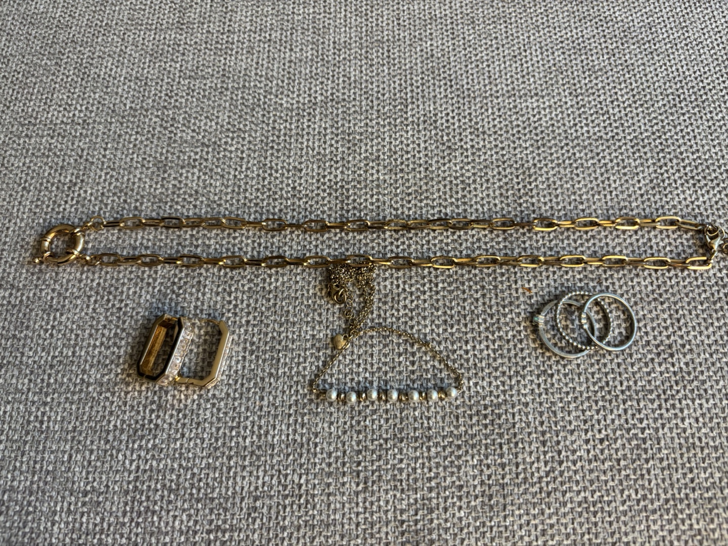 Selling a set of assorted jewelry! Includes a gold chain necklace, a dainty gold bracelet with pearls, a pair of gold and clear stone earrings, and three silver rings.