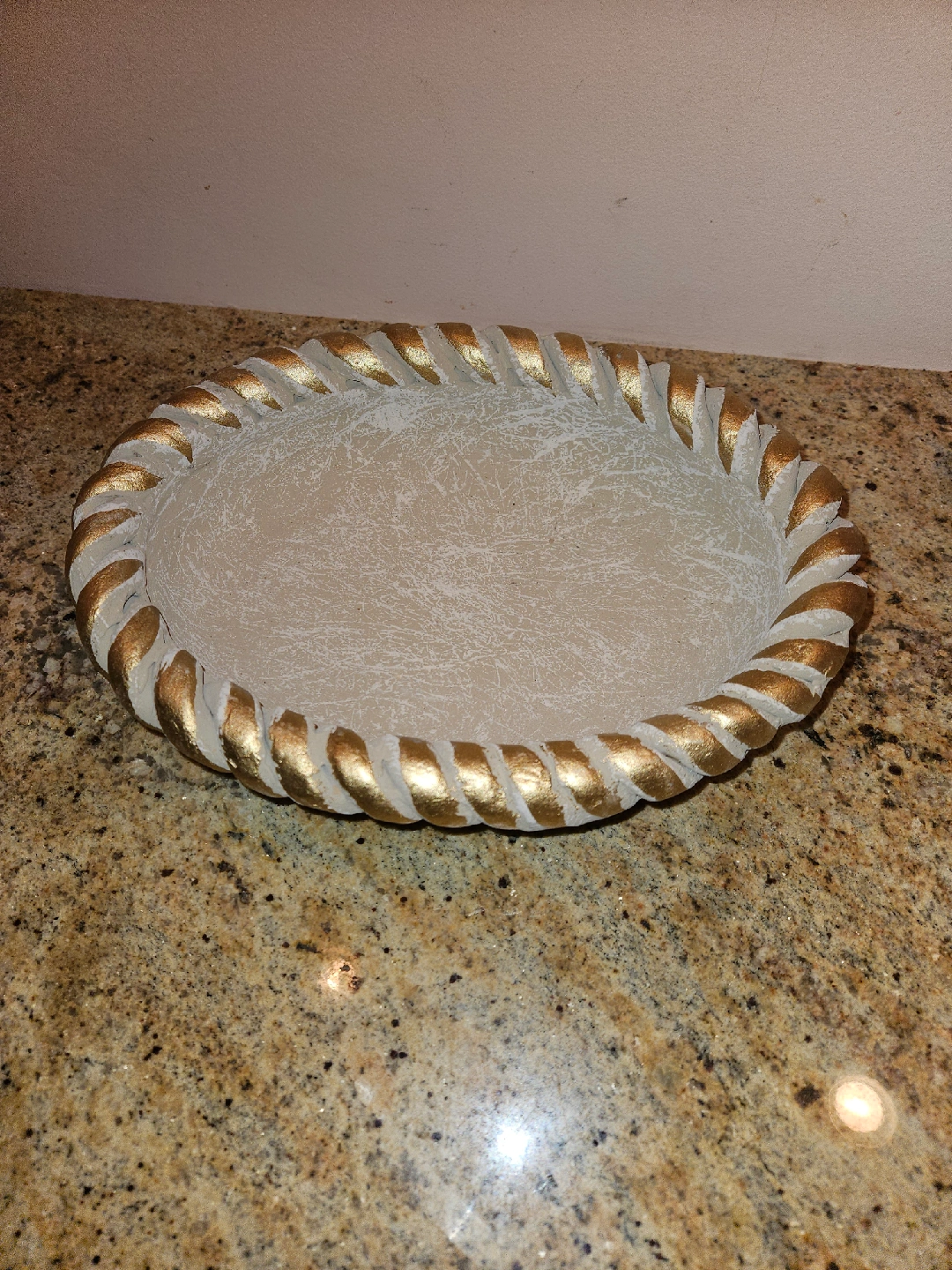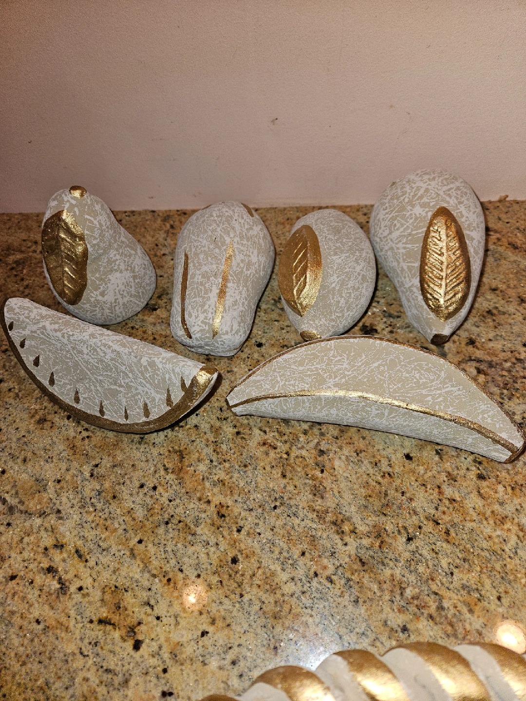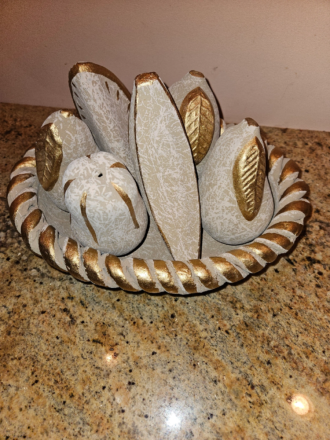 Selling a cute decorative fruit bowl set! It features a round bowl with a braided edge and several faux fruits in a matching style. The fruits have a textured, off-white finish with gold leaf accents, adding a touch of elegance to any space. Perfect for adding a unique touch to your home decor