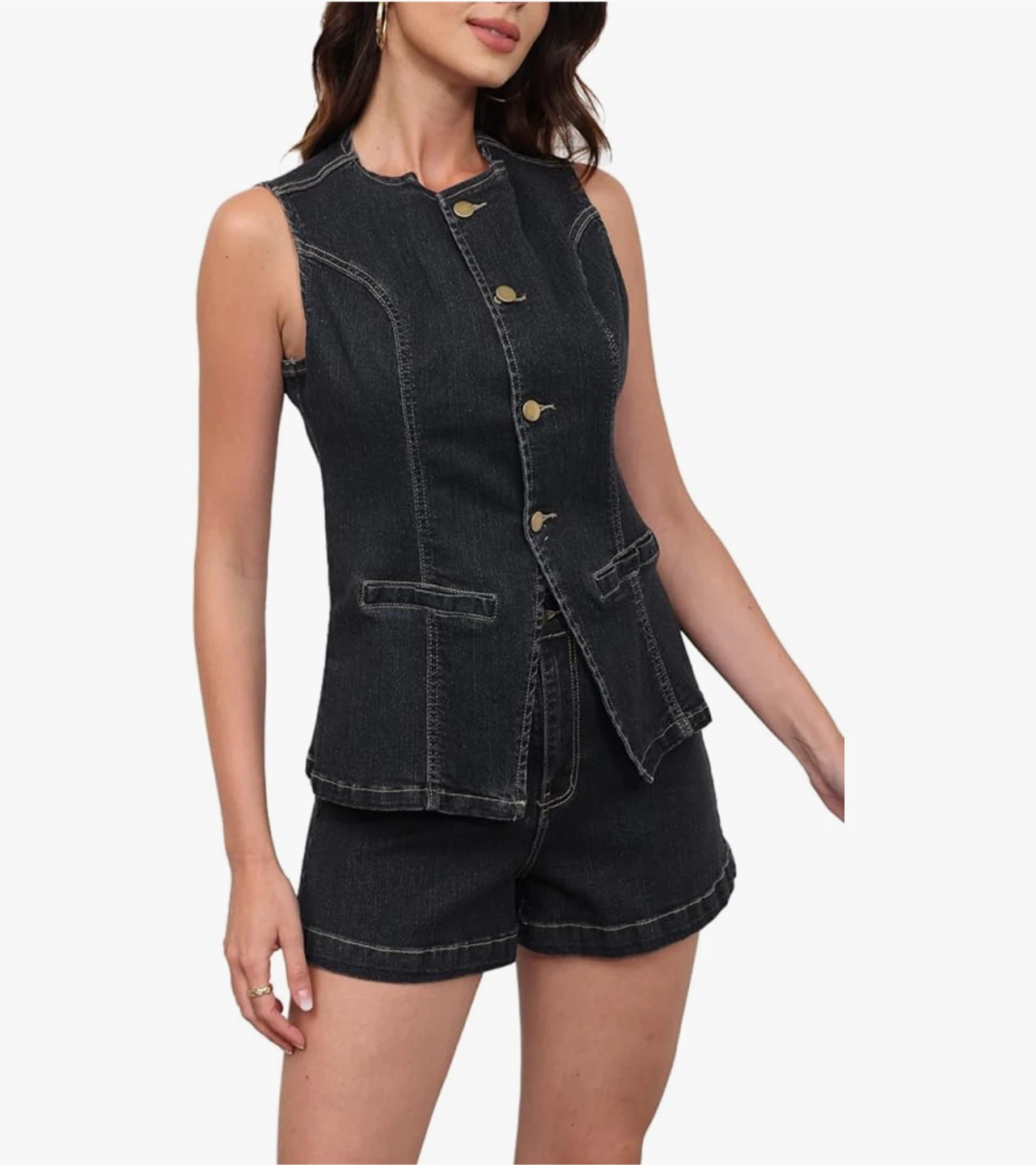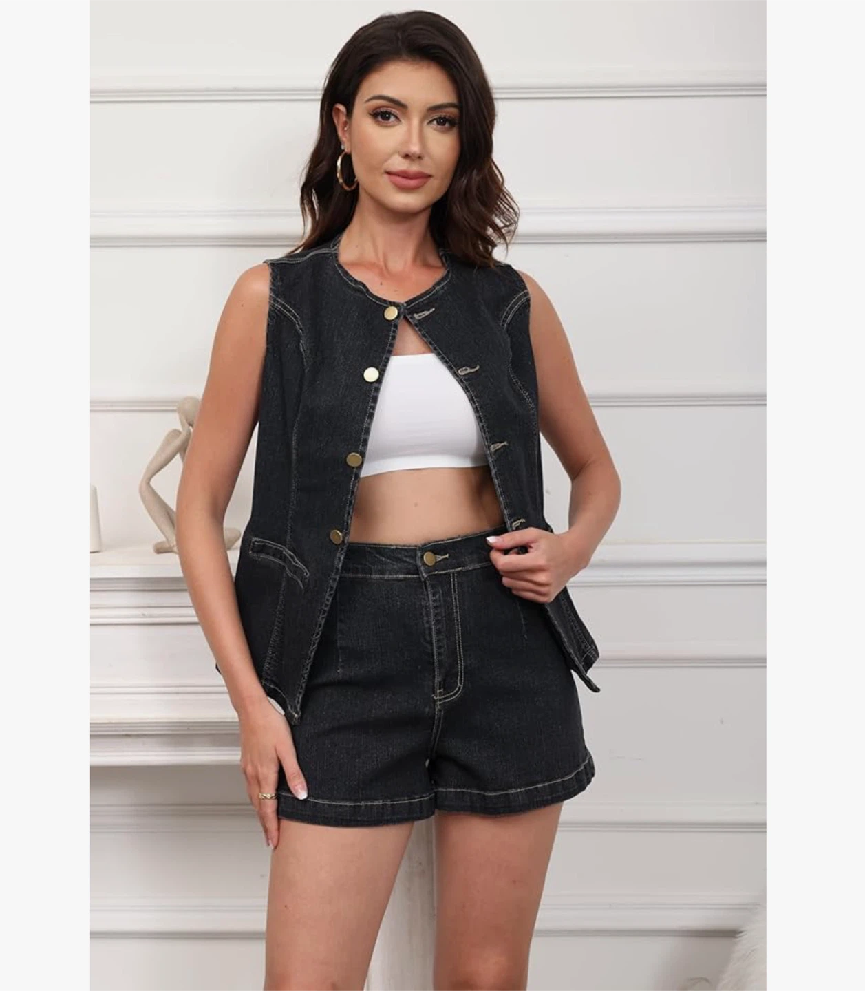 Selling a stylish black denim vest and shorts set! This set is perfect for a chic, casual look. The vest features button-down detailing, and the shorts are a comfortable length. Great for summer outings or a night out with friends.