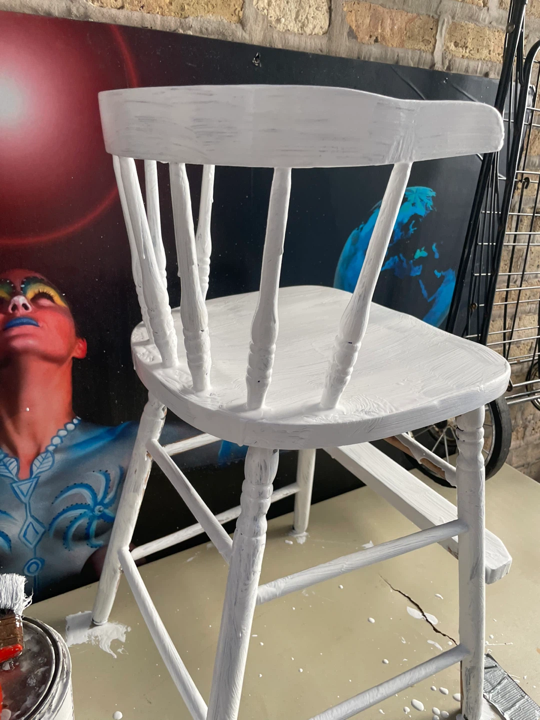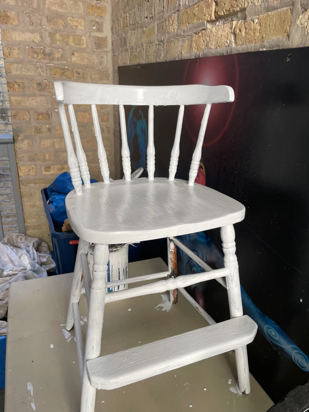 Selling a repainted wooden high chair. It's been painted white, giving it a fresh, clean look. Perfect for a young child!