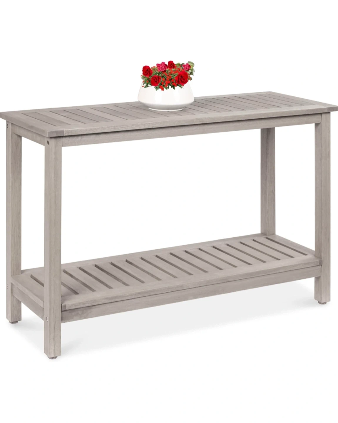 Selling a grey wooden console table, perfect for an entryway or living room! It has a nice, neutral colour and a convenient lower shelf for storage or display. Dimensions are 48 inches wide and 30 inches tall. There are some visible scratches and wear, as shown in the photos.