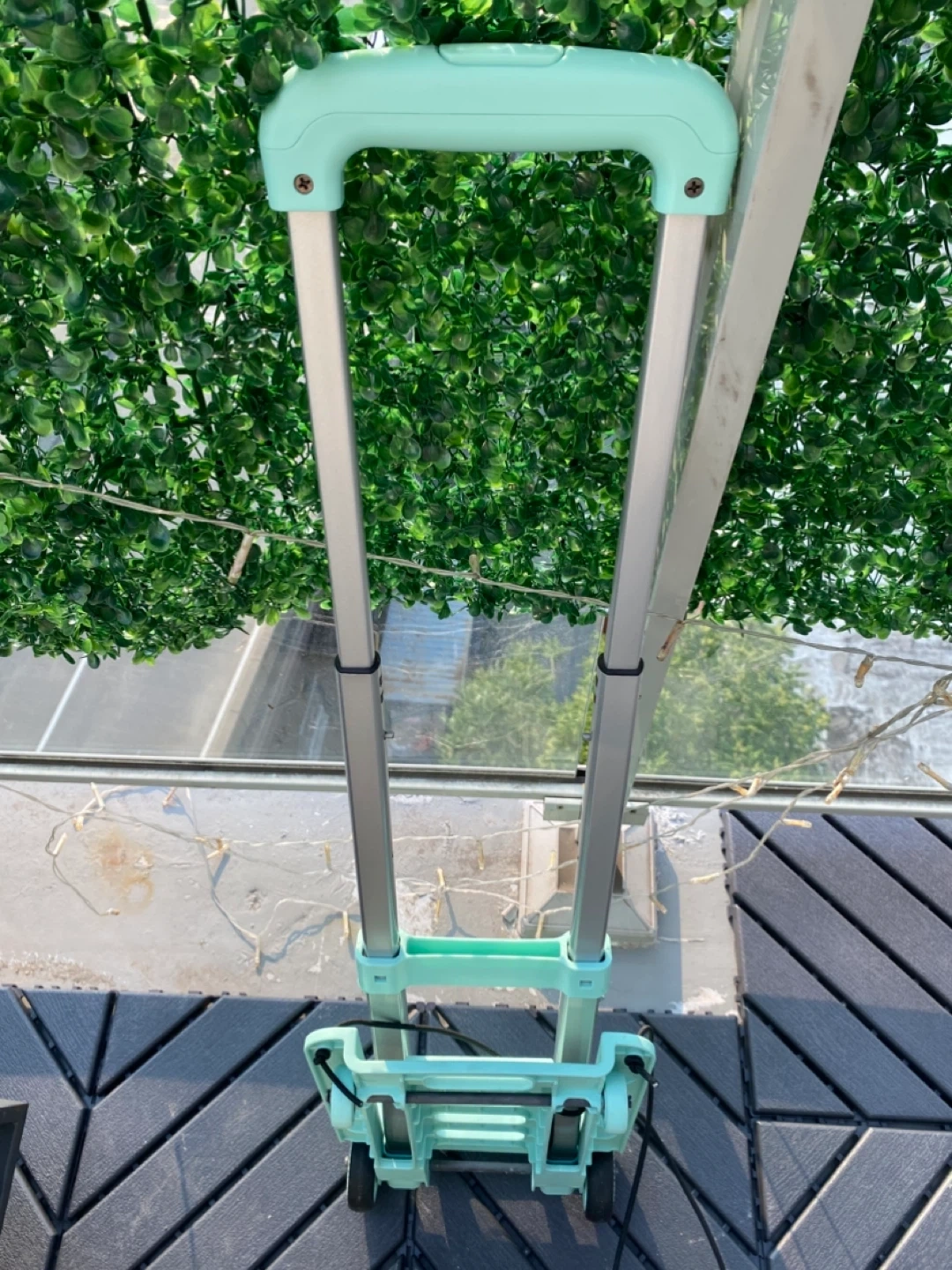 This is a handy mint green folding luggage cart! It's perfect for carrying groceries, boxes, or luggage. It's lightweight and easy to store when not in use