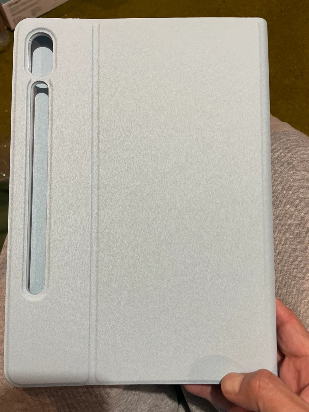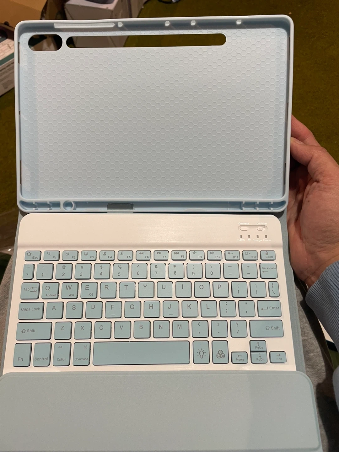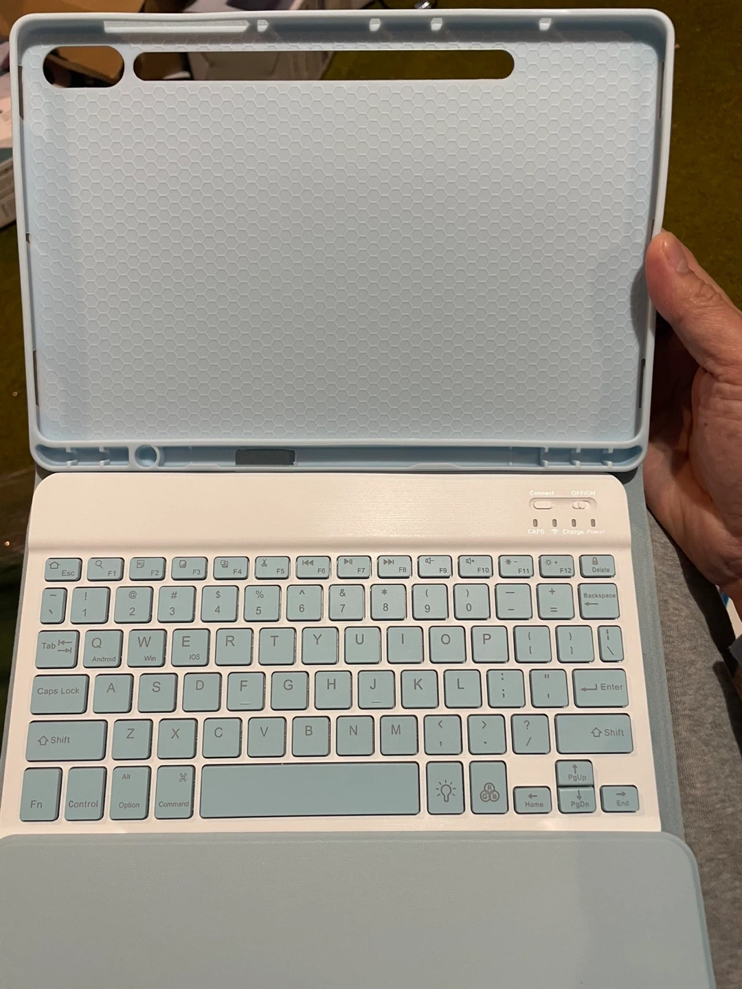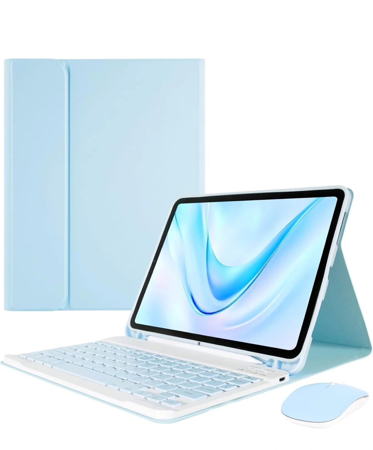 This light blue case features a detachable Bluetooth keyboard and includes a matching mouse. It's compatible with iOS, Windows, and Android devices. The case also has a slot for a stylus.