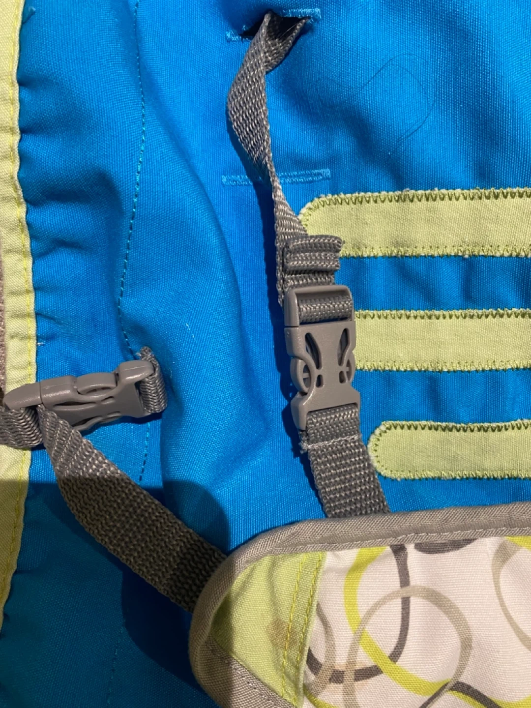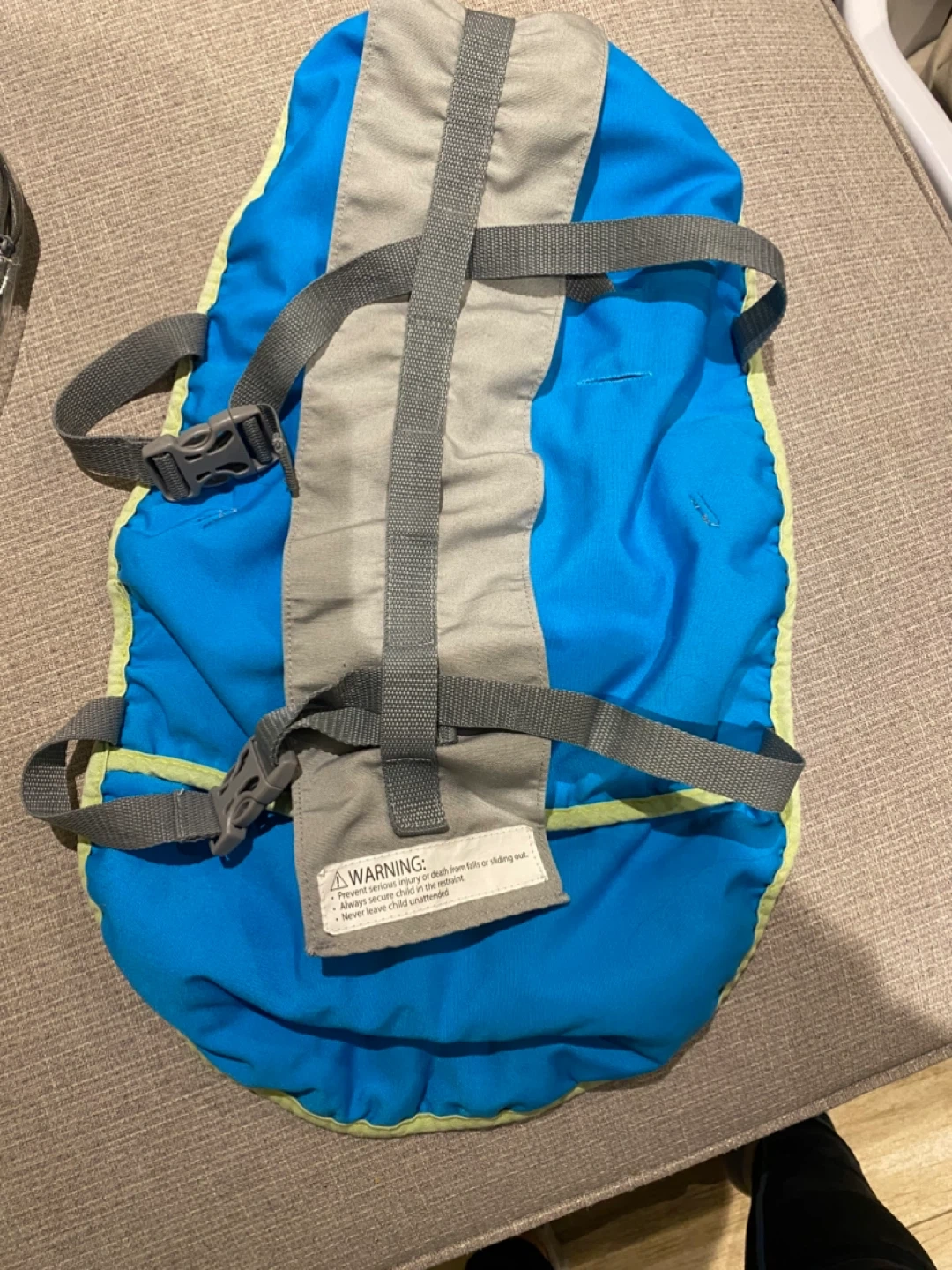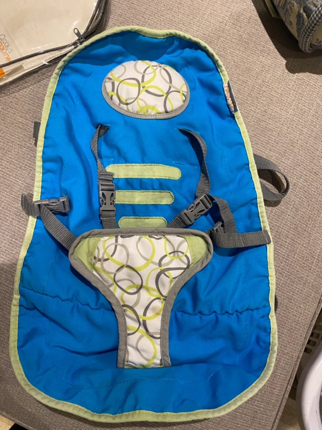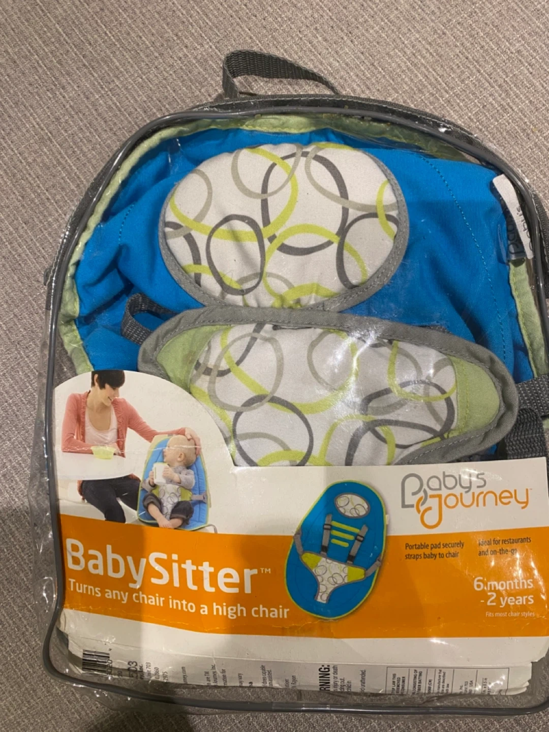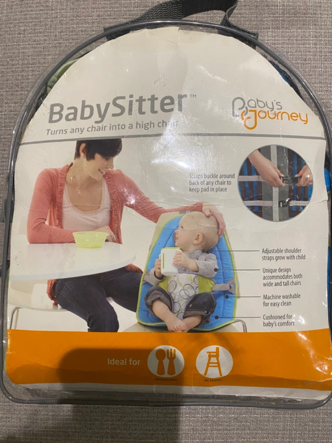 This Baby's Journey BabySitter portable seat turns any chair into a high chair. It has adjustable shoulder straps that grow with the child. It's machine washable for easy cleaning and cushioned for baby's comfort. Ideal for restaurants and at home. It is light wait, compact and easy to set up. It’s comes in its original packagings, all clips work perfectly. There is some light discolouration from use (please refer to pictures for those details).