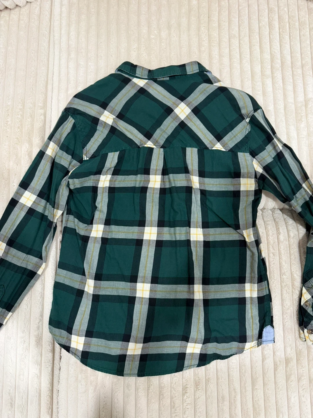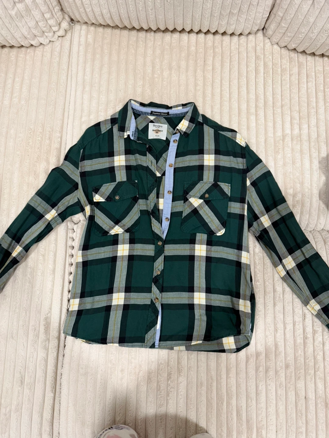 This is a green plaid flannel shirt from Bershka. It's a size S and made in Bangladesh. It features two chest pockets and a button-up front.