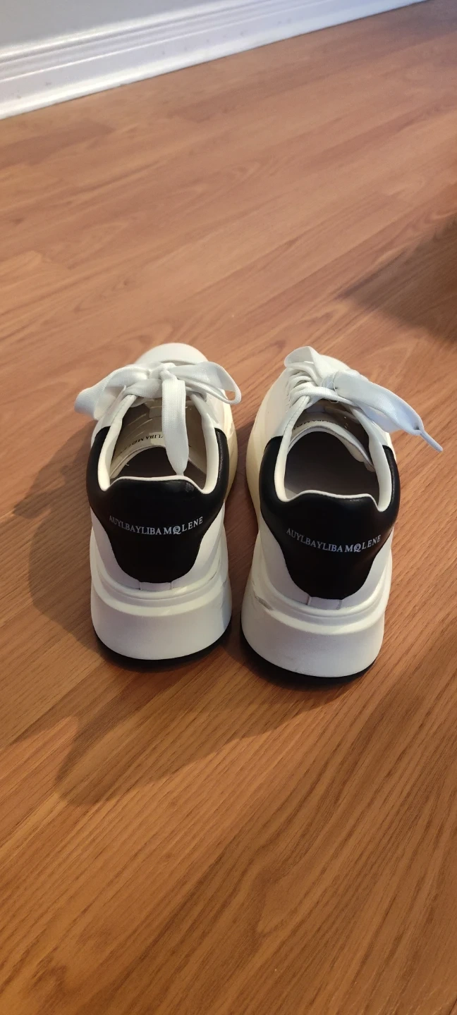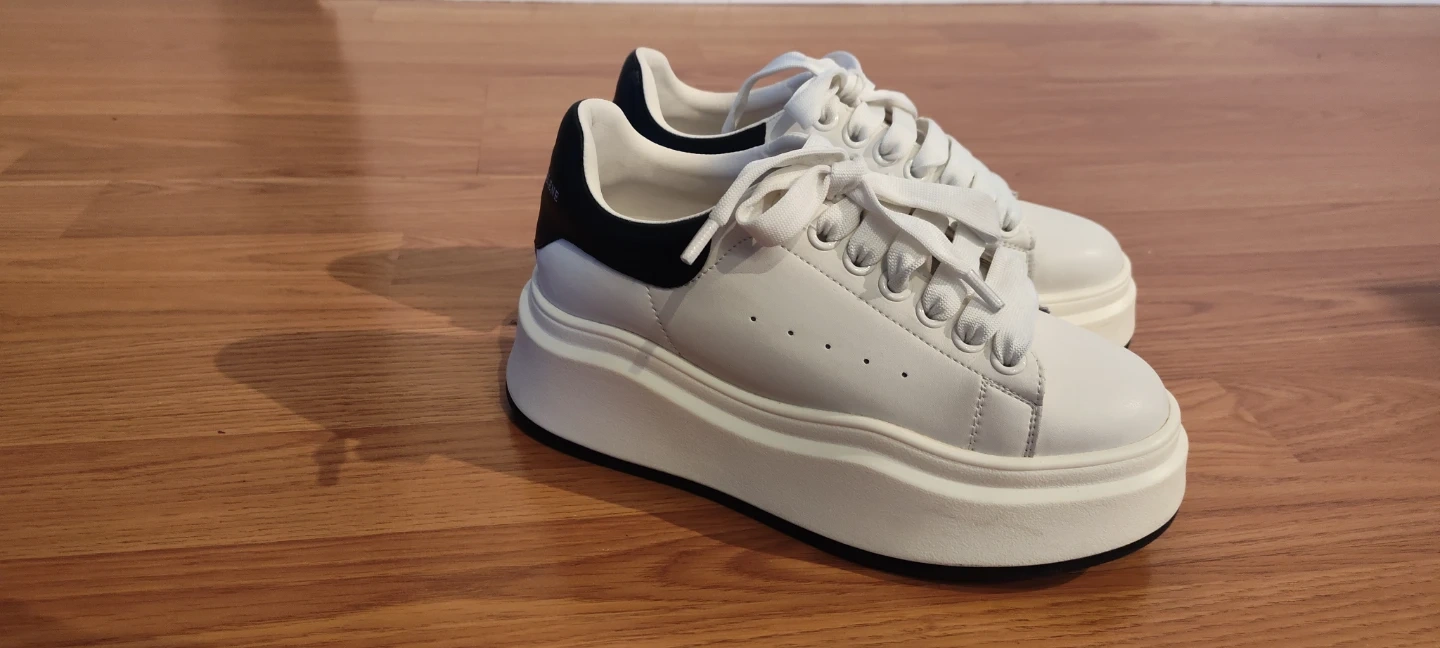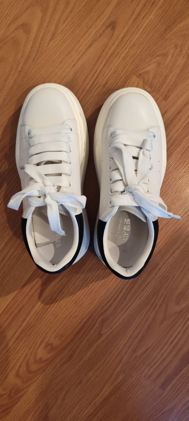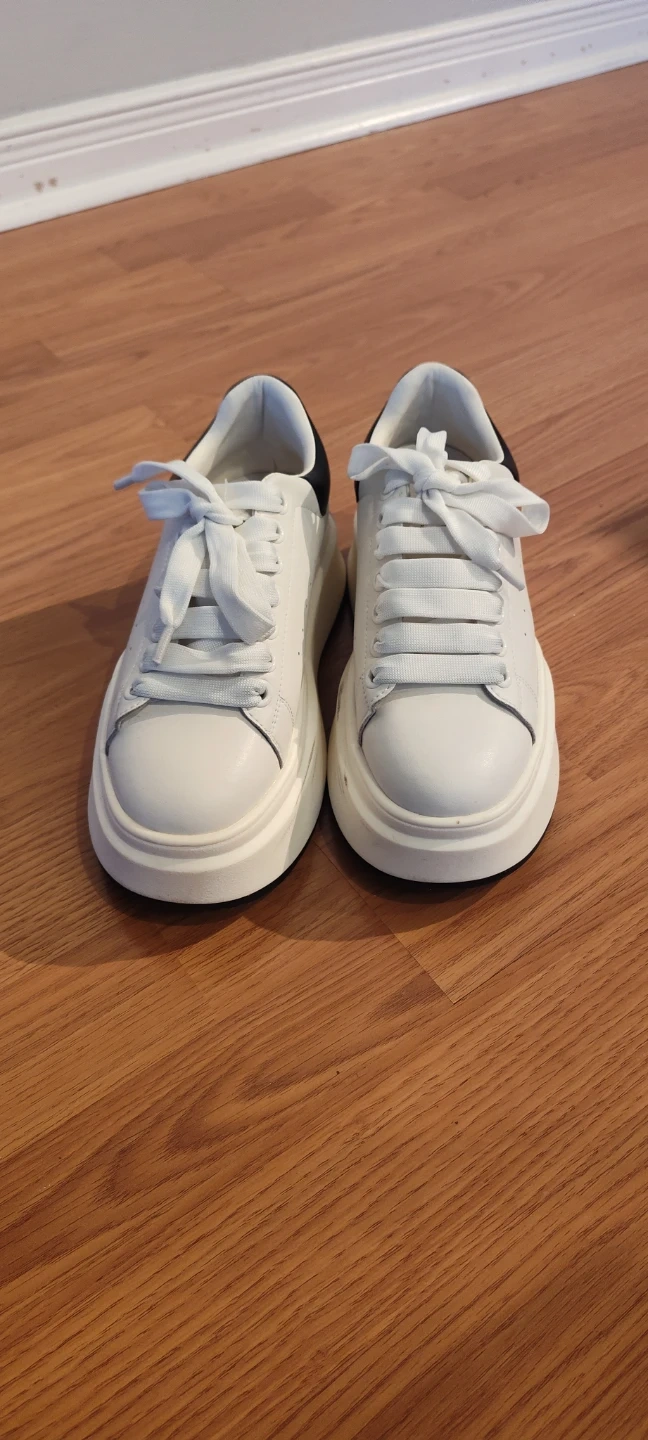 These white platform sneakers feature a black heel detail and lace-up closure. They're made from a leather-like material with a chunky sole. A stylish choice for everyday wear!