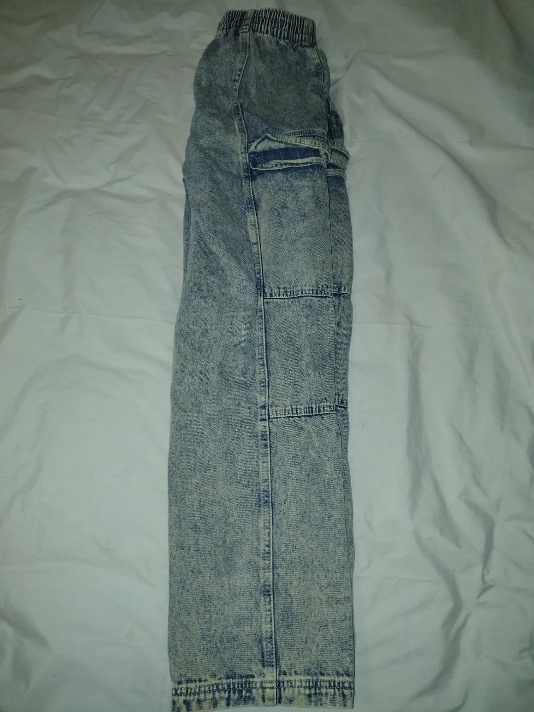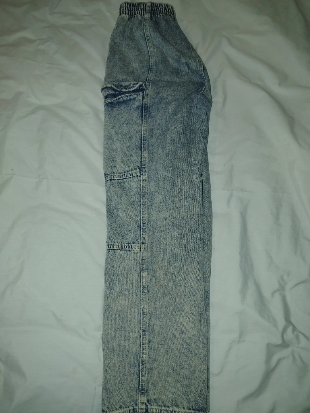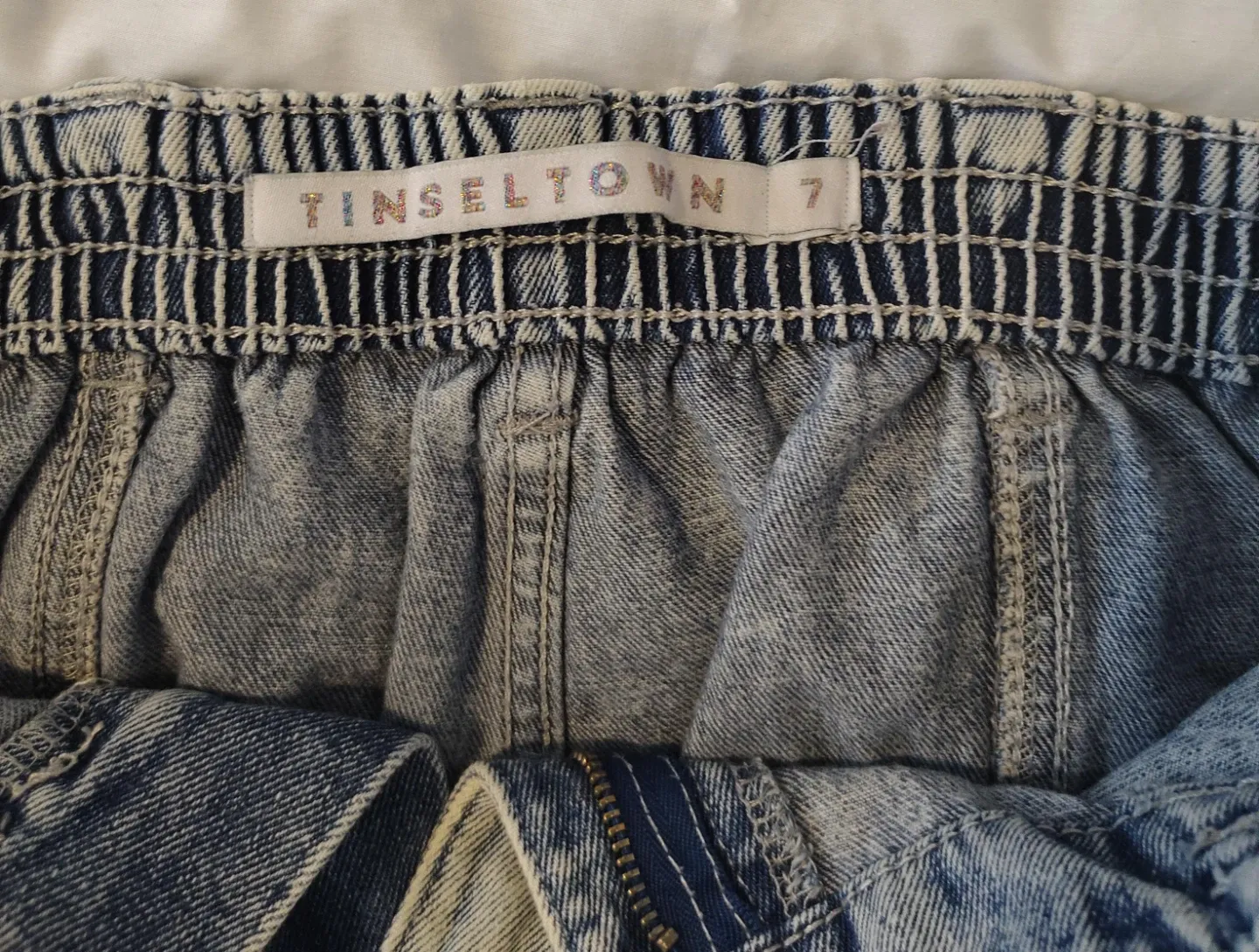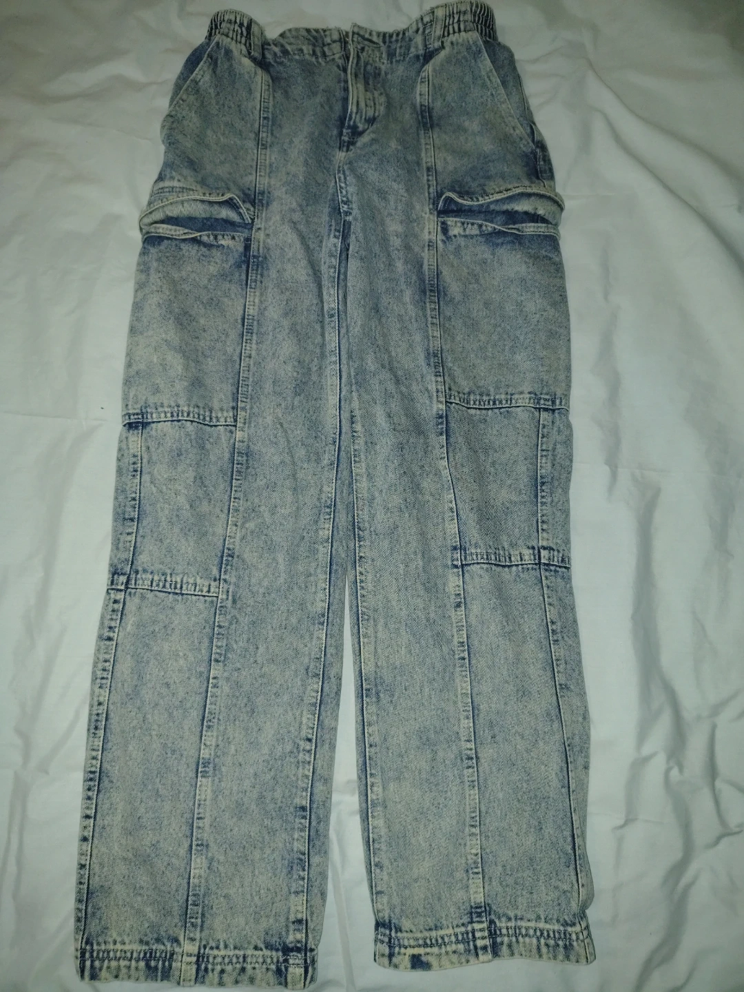 Acid wash denim cargo pants by TINSEL TOWN. Elastic waistband with zipper fly. Two front pockets and two cargo pockets on the legs. Size 7.