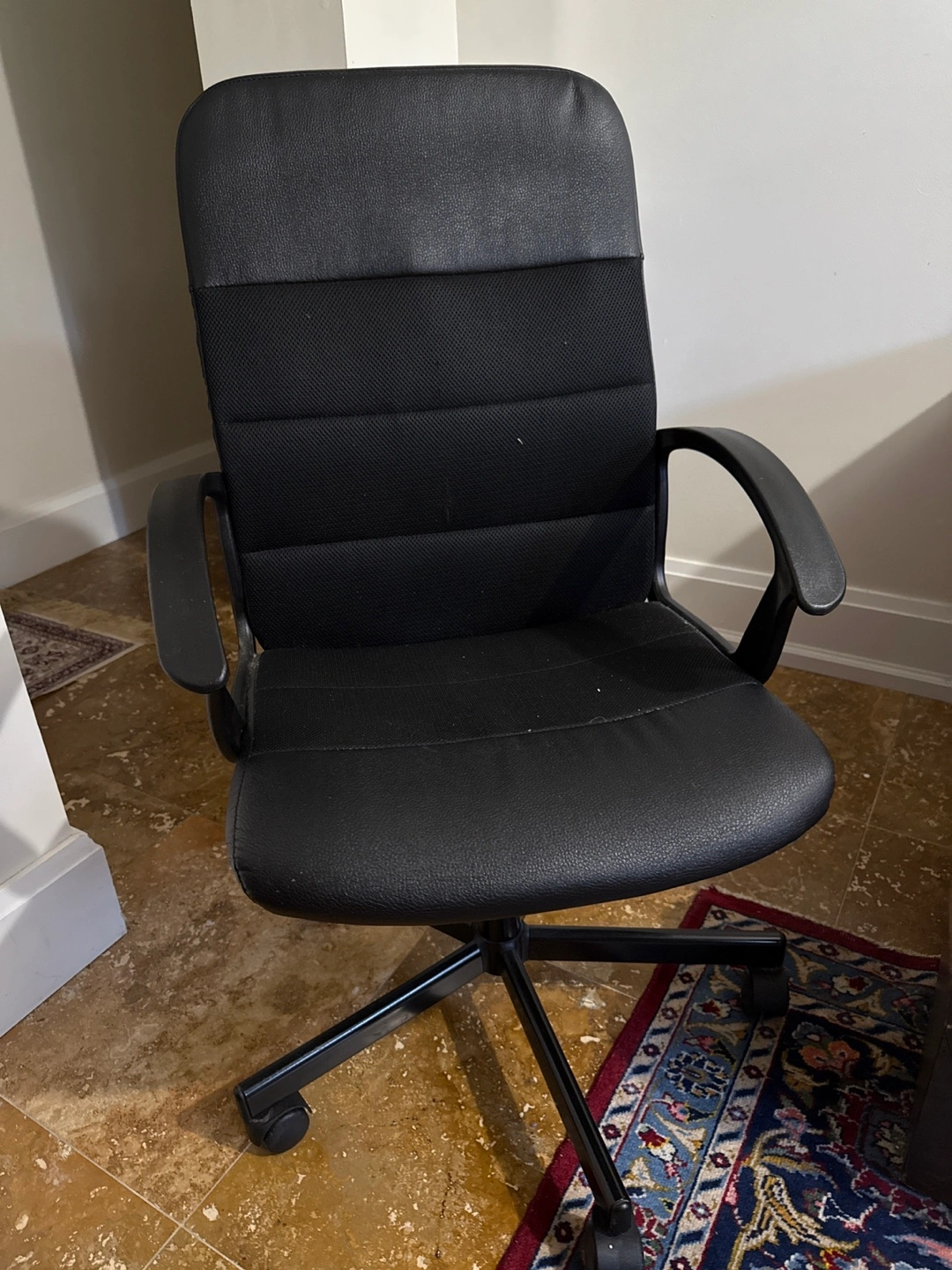 Selling a black office chair in good condition. It features a comfortable seat and backrest, perfect for long hours of work or study. The chair has adjustable height and a swivel base for easy movement. It's a great addition to any home office or workspace
