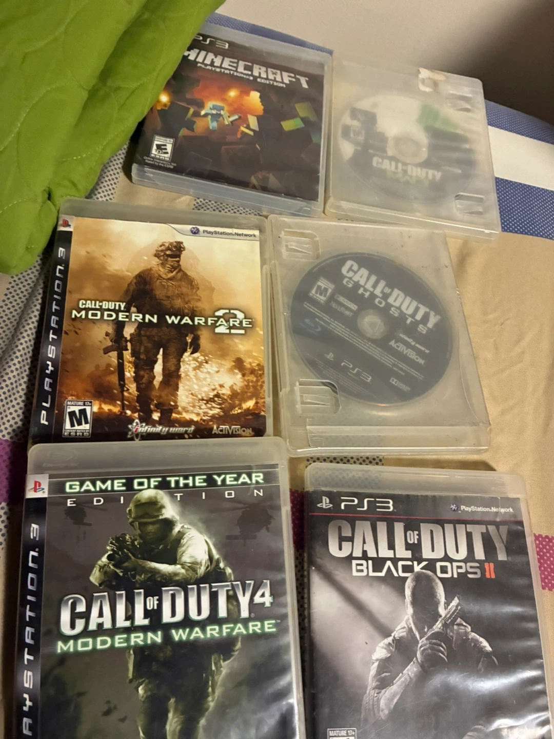 Bundle of five PlayStation 3 games. Includes Minecraft: PlayStation Edition, Call of Duty 4: Modern Warfare (GOTY Edition), Call of Duty: Modern Warfare 2, Call of Duty: Ghosts, and Call of Duty: Black Ops 2