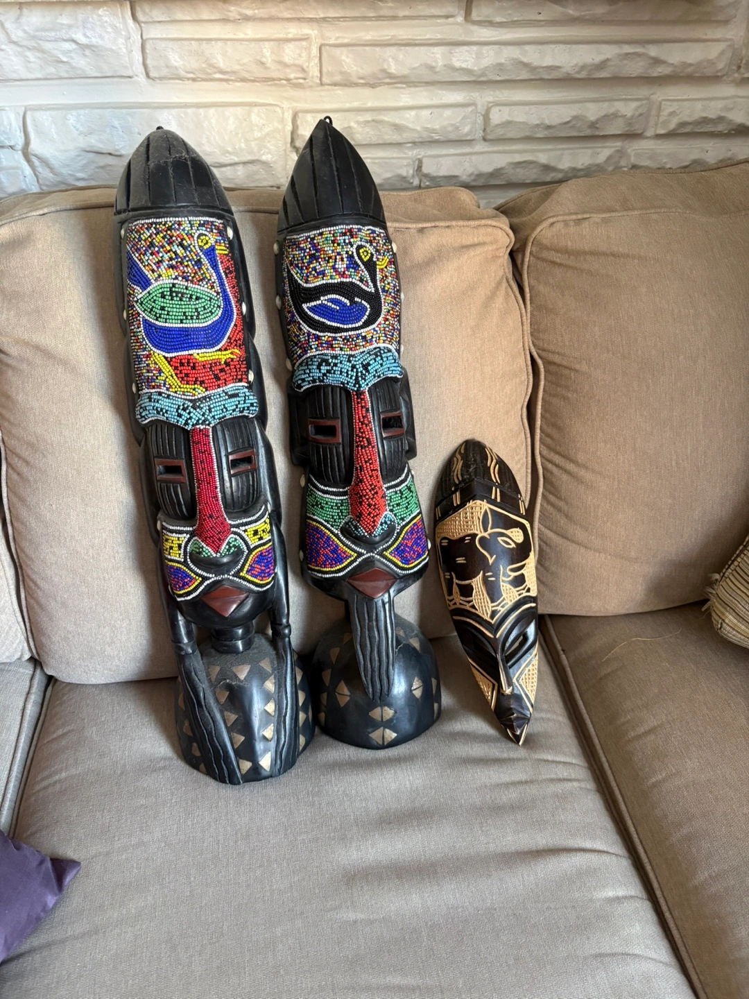 This set includes three decorative tribal masks. Two larger masks feature beadwork with bird designs, while a smaller mask has carved animal motifs. They're made of wood and beads.