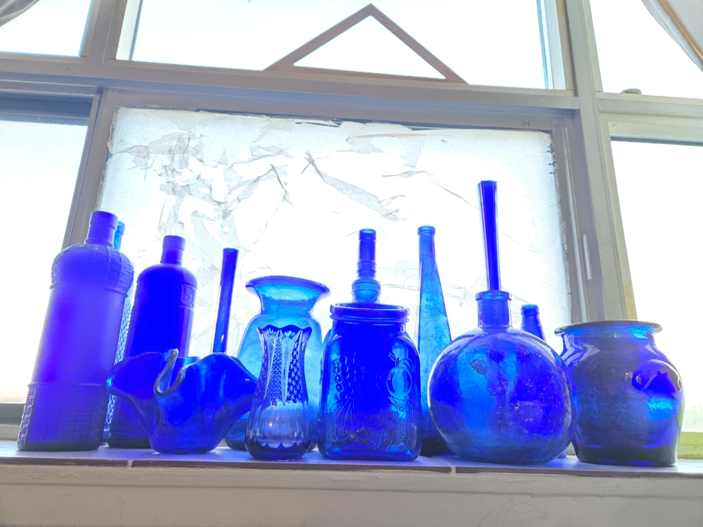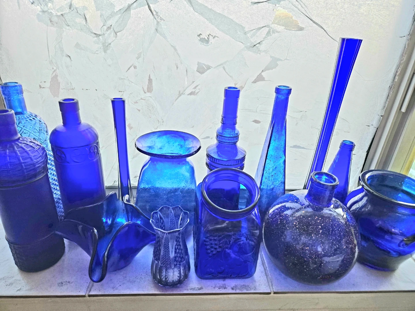 Assorted blue glass, from vintage to functional to unique and decorative. Looks lovely in a window! 14 pieces in all.