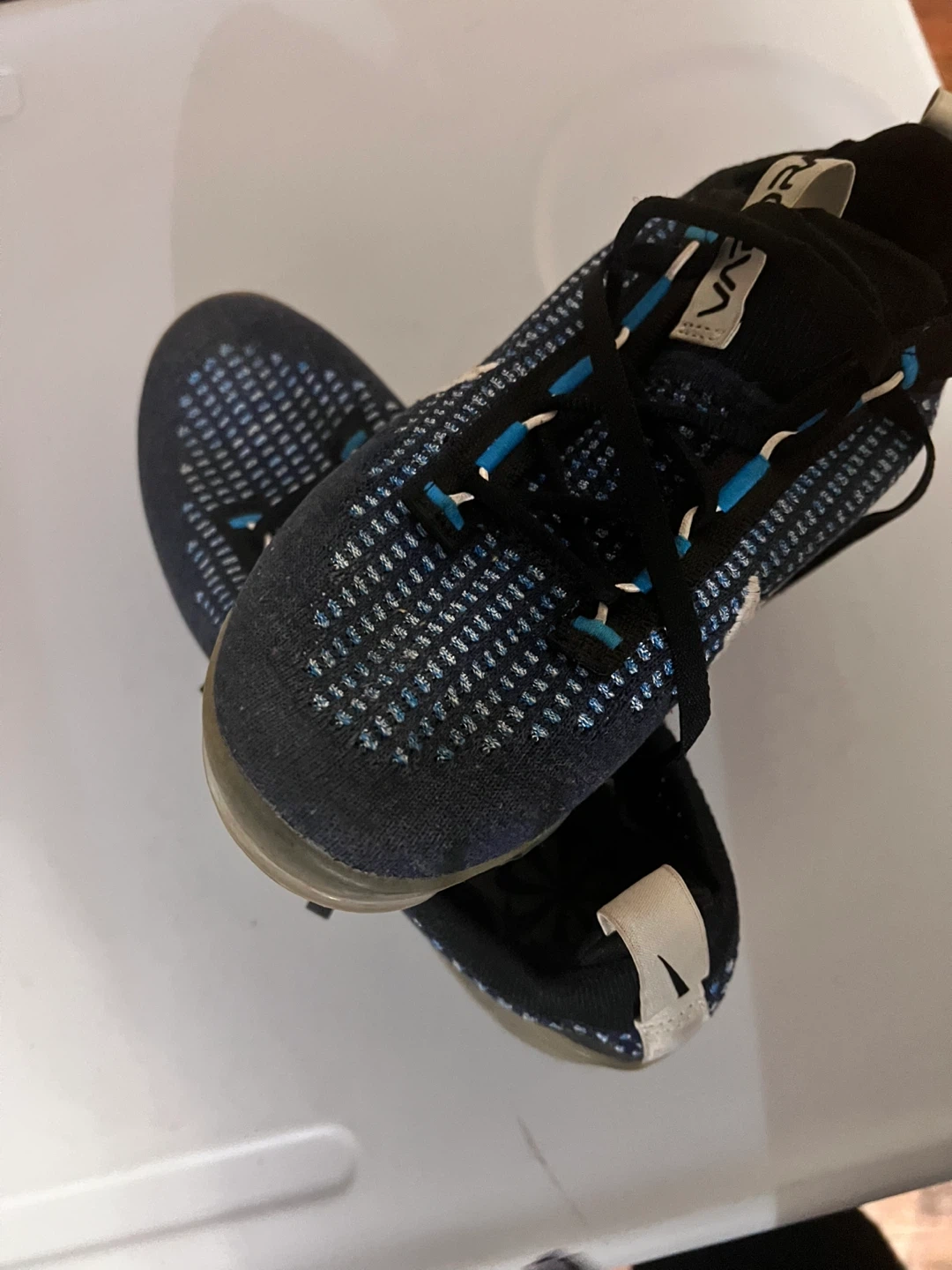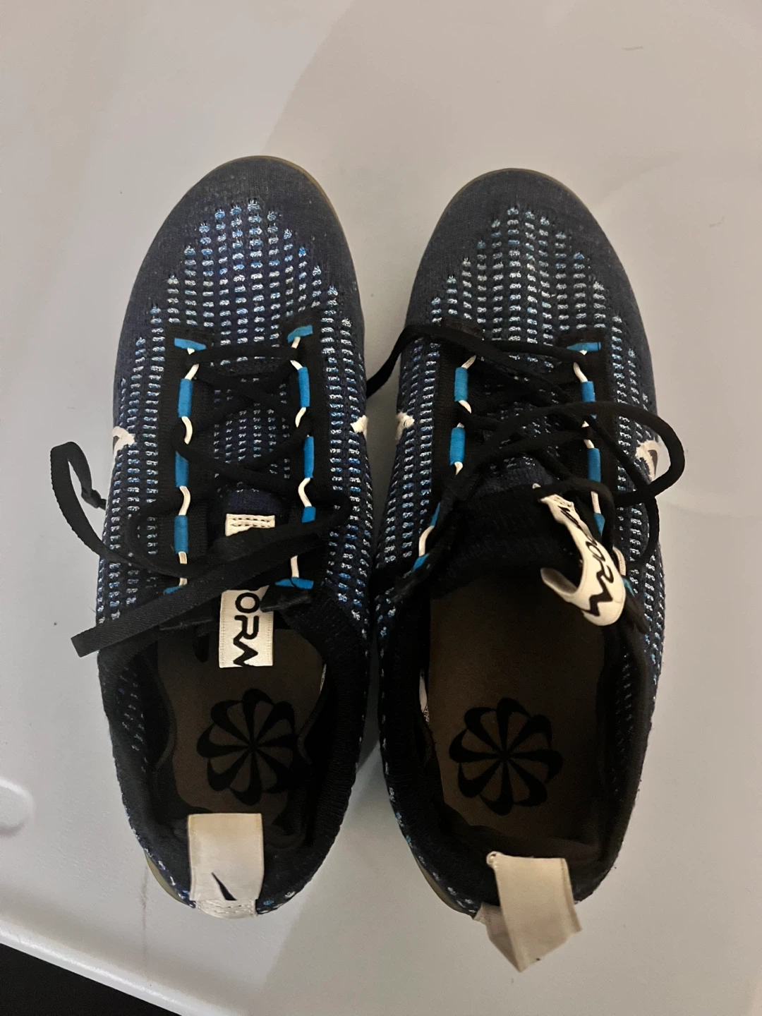These Nike Air VaporMax shoes feature a dark blue and white knit upper with a visible air sole unit. They're designed for comfort and performance. Size is not visible on the shoes.