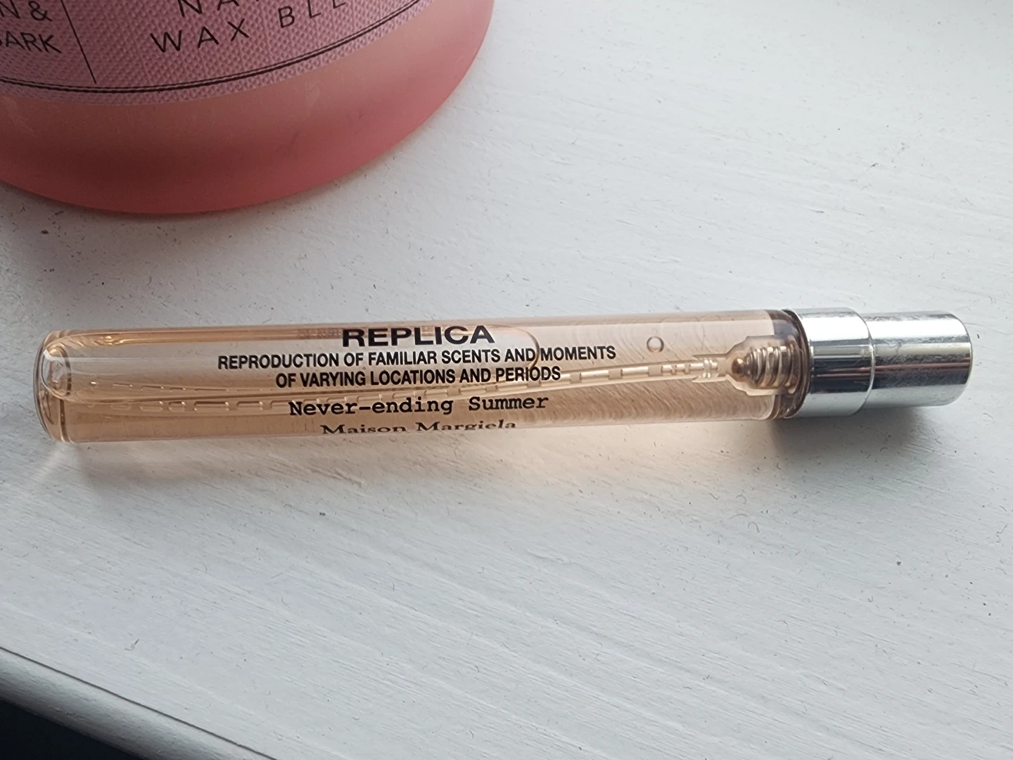 This is a travel-sized spray of Maison Margiela's REPLICA "Never-ending Summer" Eau de Toilette. It's a 10ml bottle with a spray applicator.
