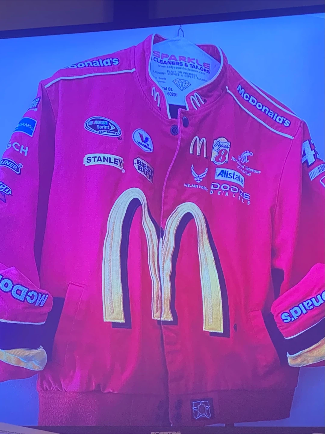 Red jacket with large McDonald's logo on front and sleeves. Features: Reed Sorenson and various sponsor logos including NASCAR Sprint, Stanley, Best Buy, Super 8, Allstate, and Dodge. Outer shell appears to be a durable fabric.
