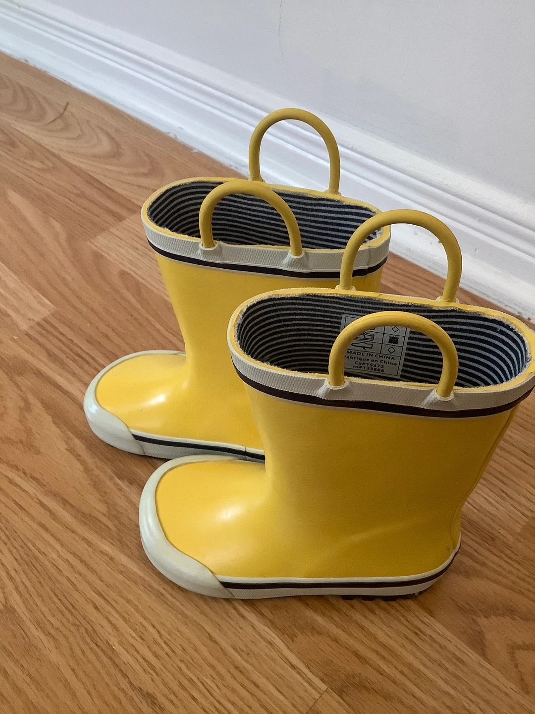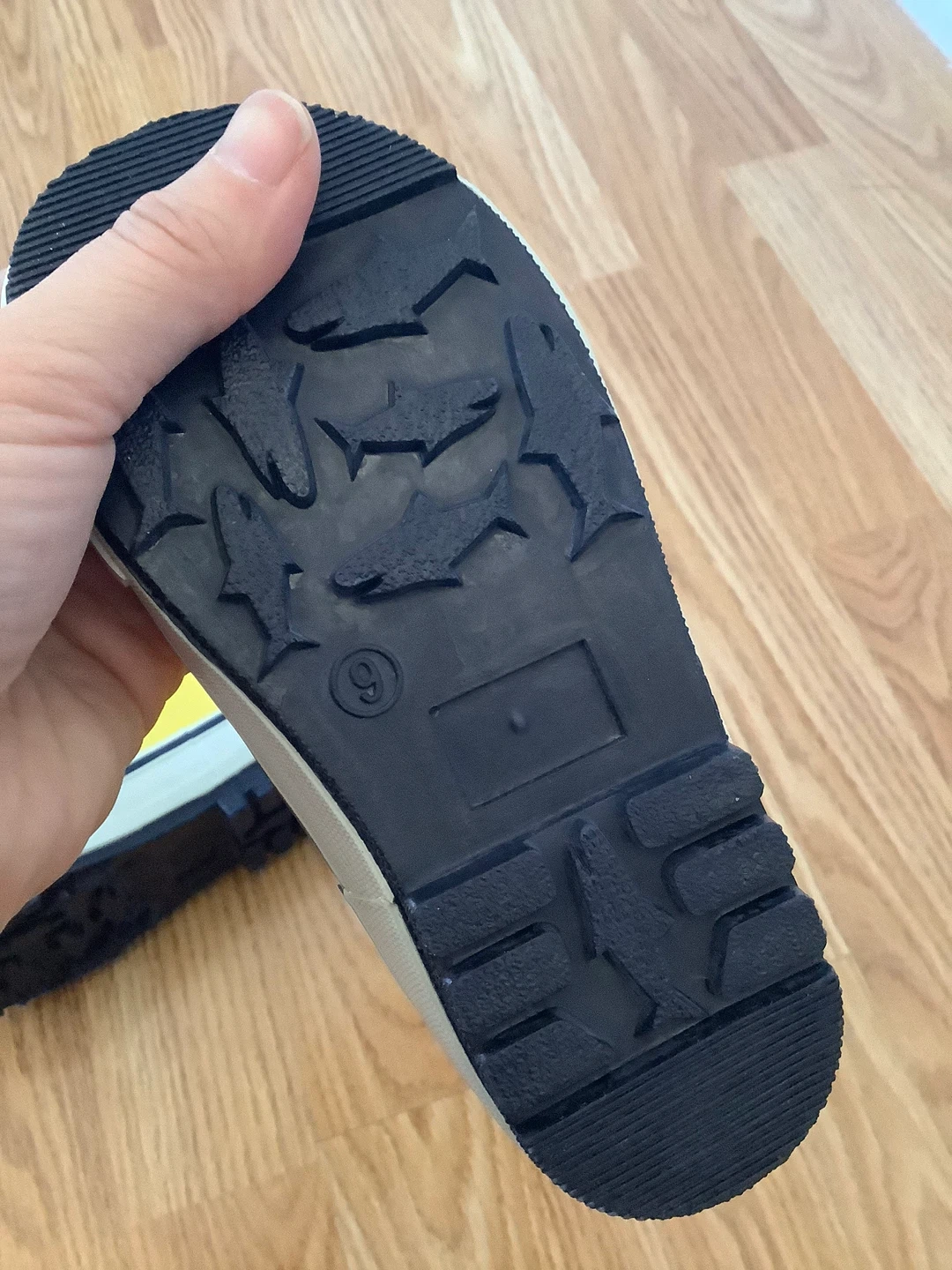 Cute yellow rain boots for kids. They feature a fun shark pattern on the sole for extra grip. Easy-pull handles make them simple to put on and take off. Perfect for puddle jumping!