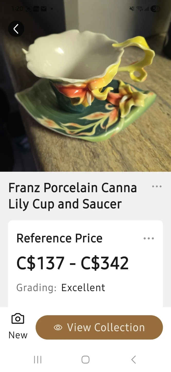 This is a rare Franz Porcelain Canna Lily cup and saucer set. It's made of porcelain and features a beautiful floral design. This set is a lovely addition to any collection or for enjoying a special tea time!