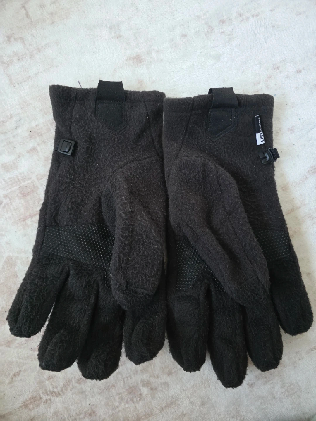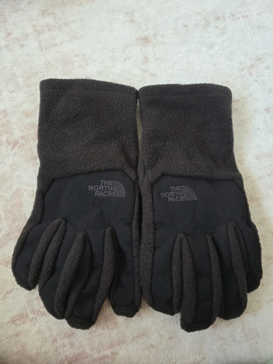 Fleece gloves from The North Face. They're black and made of soft fleece material. Palm features grip dots for better handling. Perfect for cold weather outdoor activities!