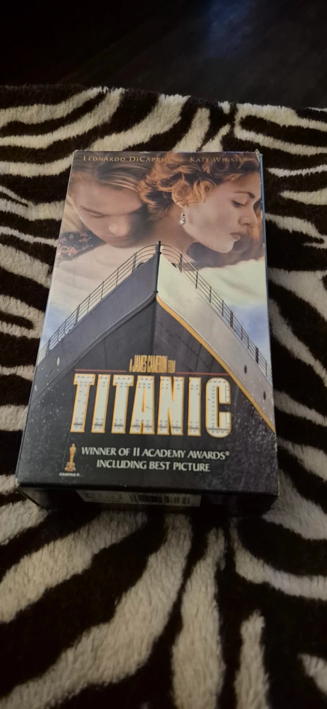 James Cameron's Titanic VHS movie starring Leonardo DiCaprio and Kate Winslet. This edition won 11 Academy Awards, including Best Picture. It's a classic film for any movie collection.