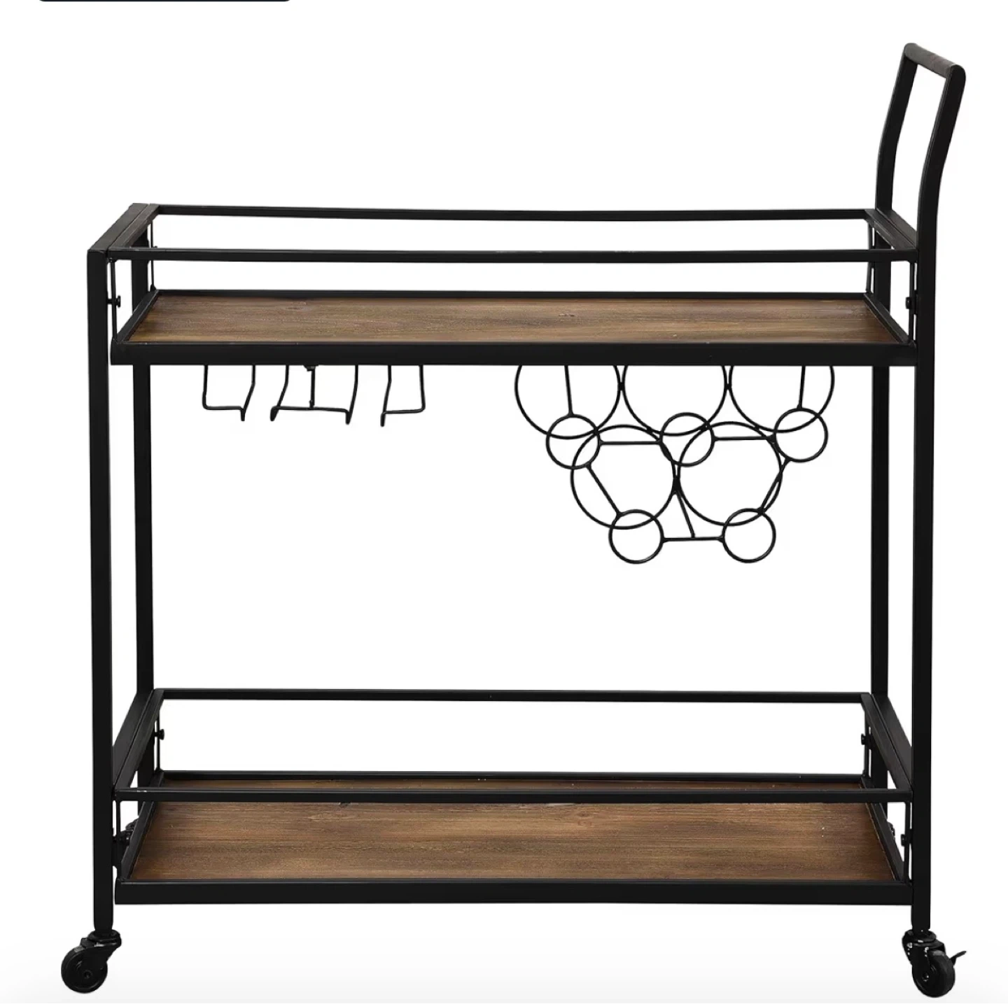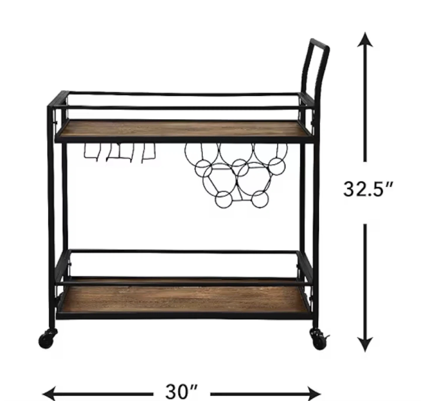 This bar cart features a two-tier design with a wood-look finish and black metal frame. It includes a rack for wine glasses and a holder for wine bottles. Dimensions are 30" W x 32.5" H. Its compact size and wheels make it easy to move around!