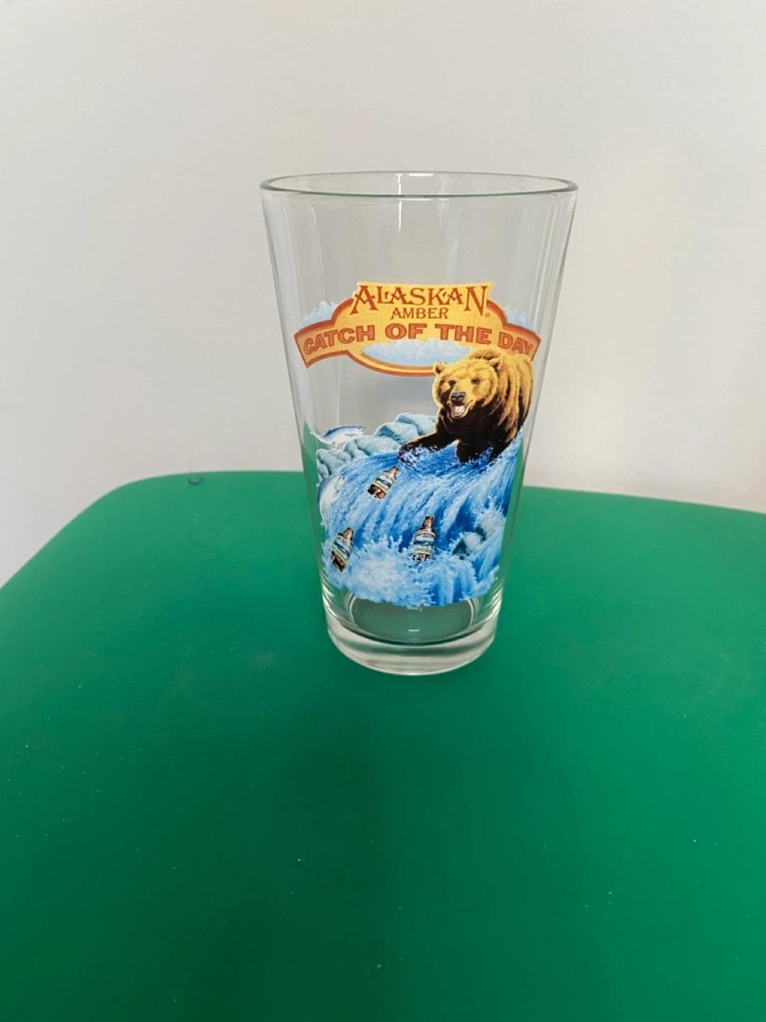 This Alaskan Amber "Catch of the Day" glass features a bear in a waterfall design. It's made of clear glass. This glass is a fun addition for any beer enthusiast!