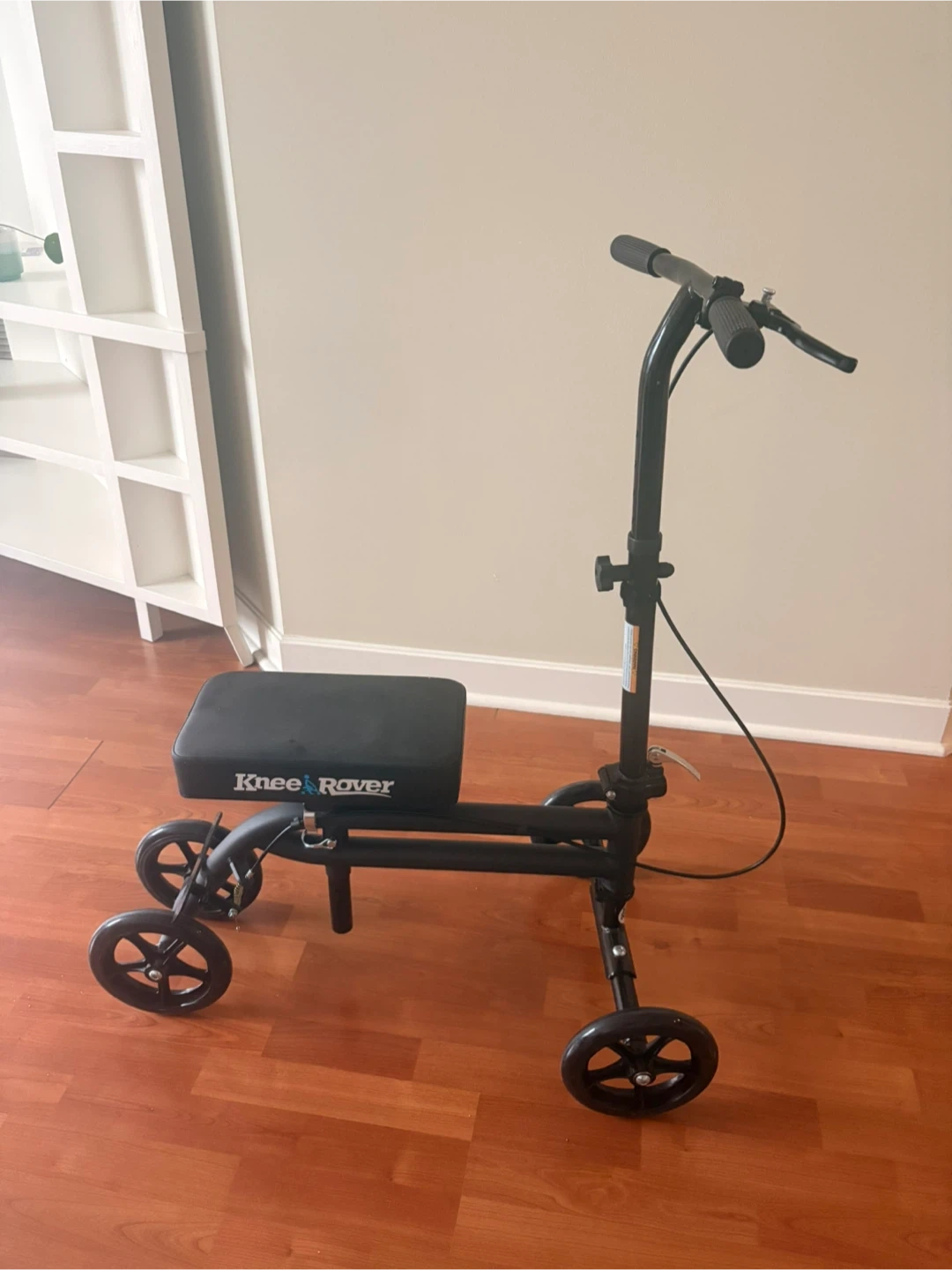 This is a KneeRover walker. It features a padded knee rest and adjustable handlebars. This walker is designed for mobility assistance.