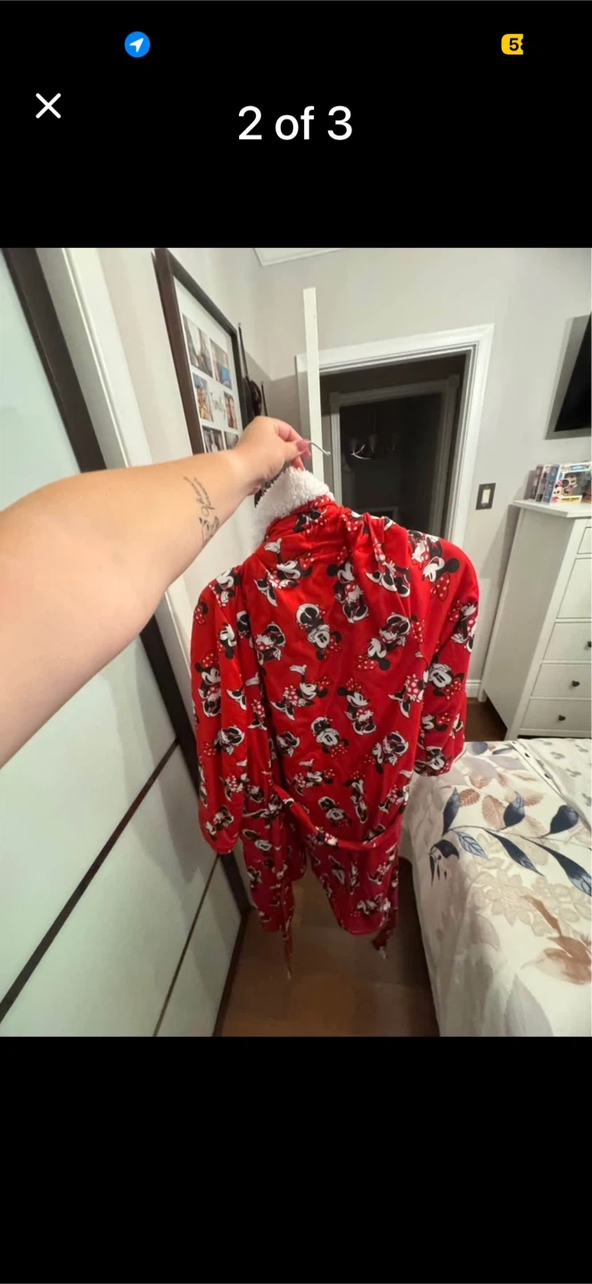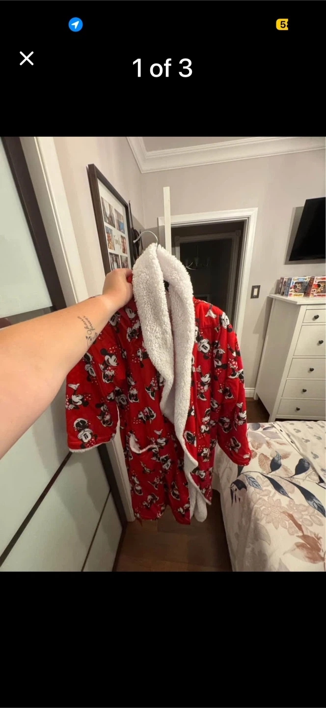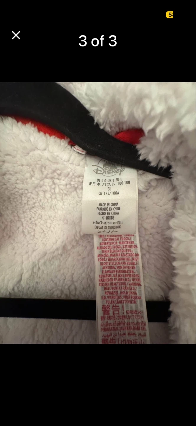 This comfy Disney robe features a vibrant red colour with a classic Minnie Mouse pattern all over. It has a cozy white sherpa-lined collar and cuffs. Size is large