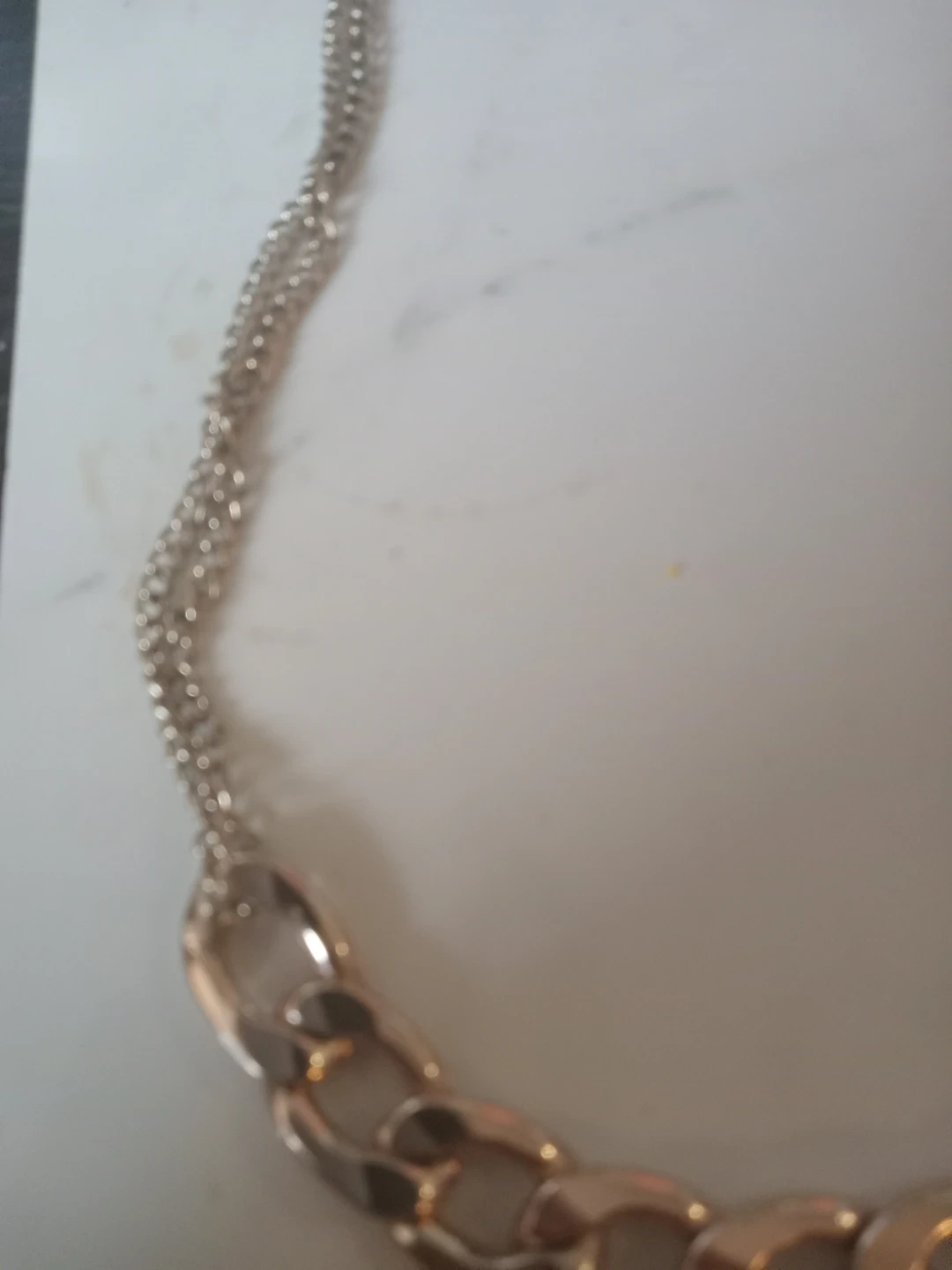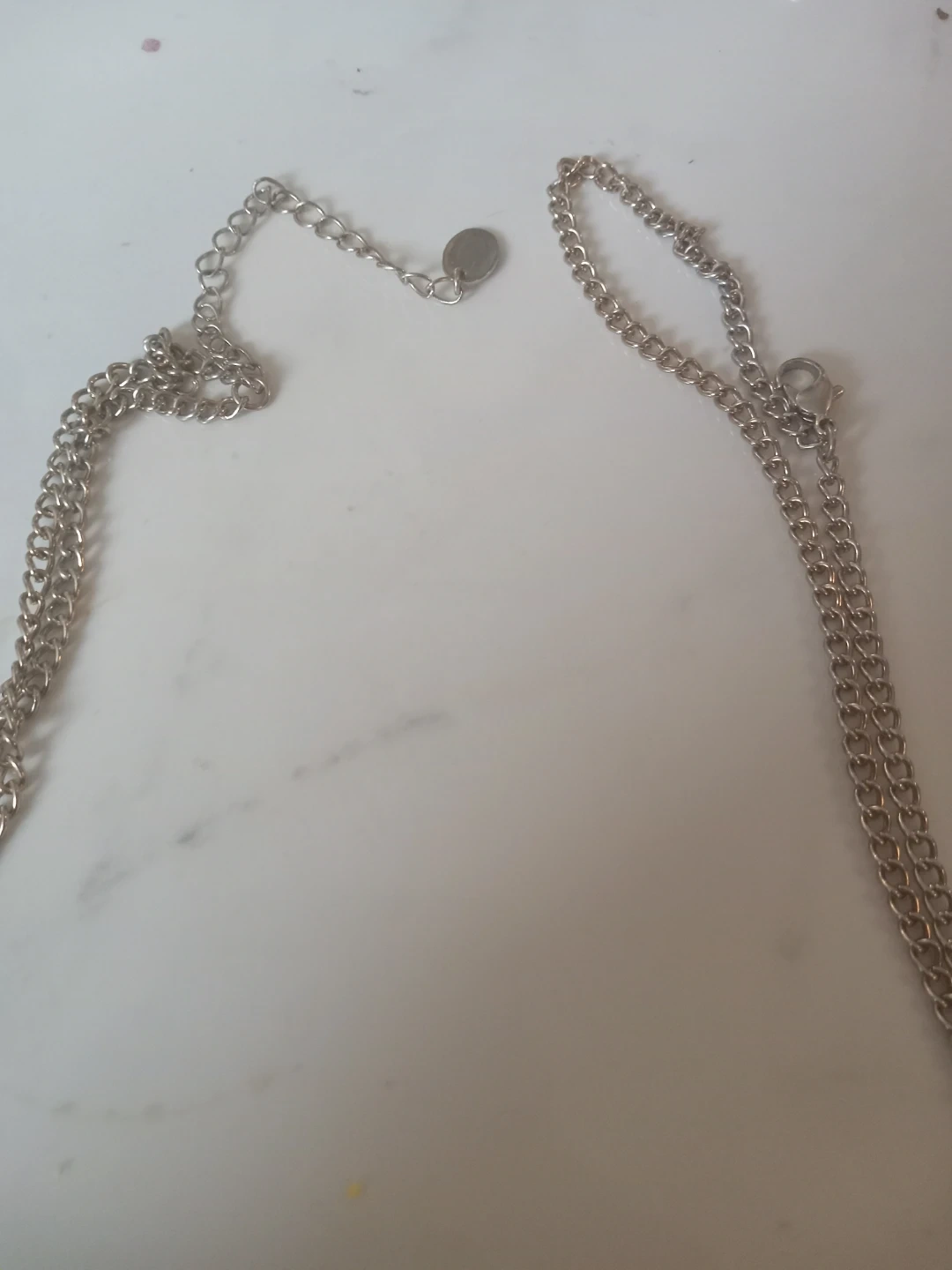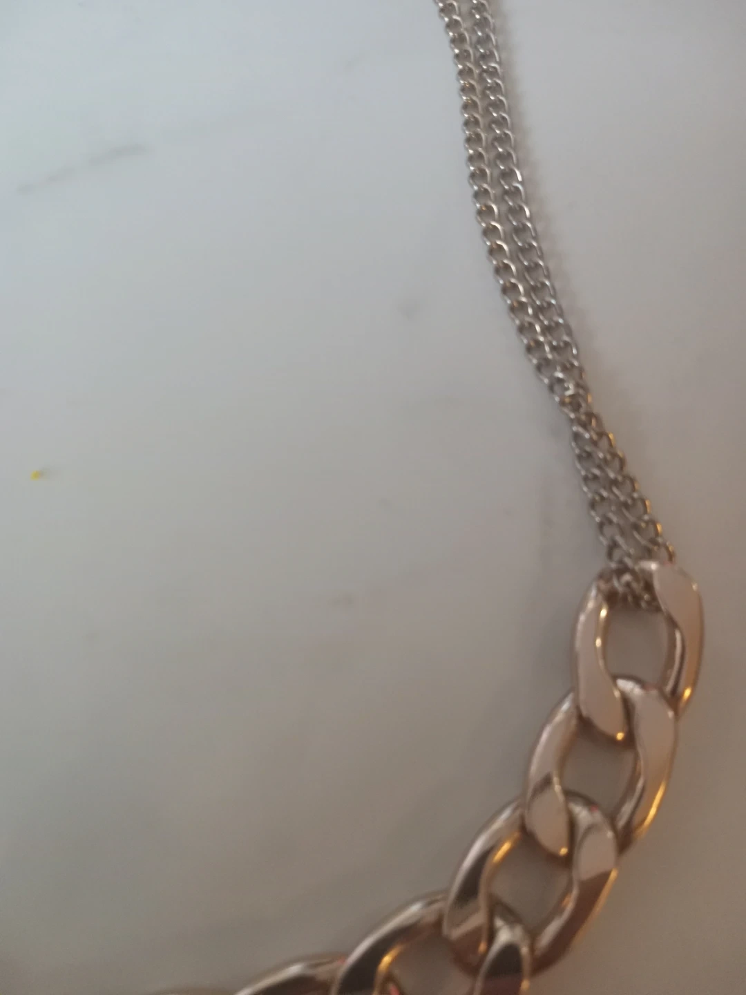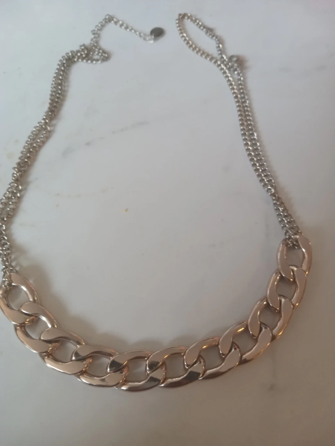 A chunky link chain necklace in a silver-tone finish. It features a double-strand delicate chain leading to a bold, large-link section. This necklace has an adjustable clasp for a comfortable fit. It's a statement piece perfect for dressing up an outfit!