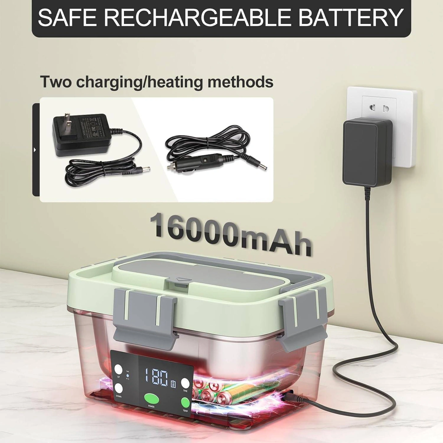 Enjoy hot food anytime with this electric heated lunch box! No need for a microwave. Cordless & Plug-in Heating Options: Built-in 16000mAh rechargeable battery allows cordless heating anywhere. Also supports AC power and car charging, making it ideal for office workers, commuters, truck drivers, and travel use.