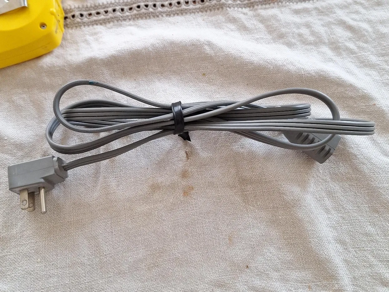 Gray power cord with a standard US plug. Cord is neatly bundled with a black strap. This cord is used for powering various electronic devices.