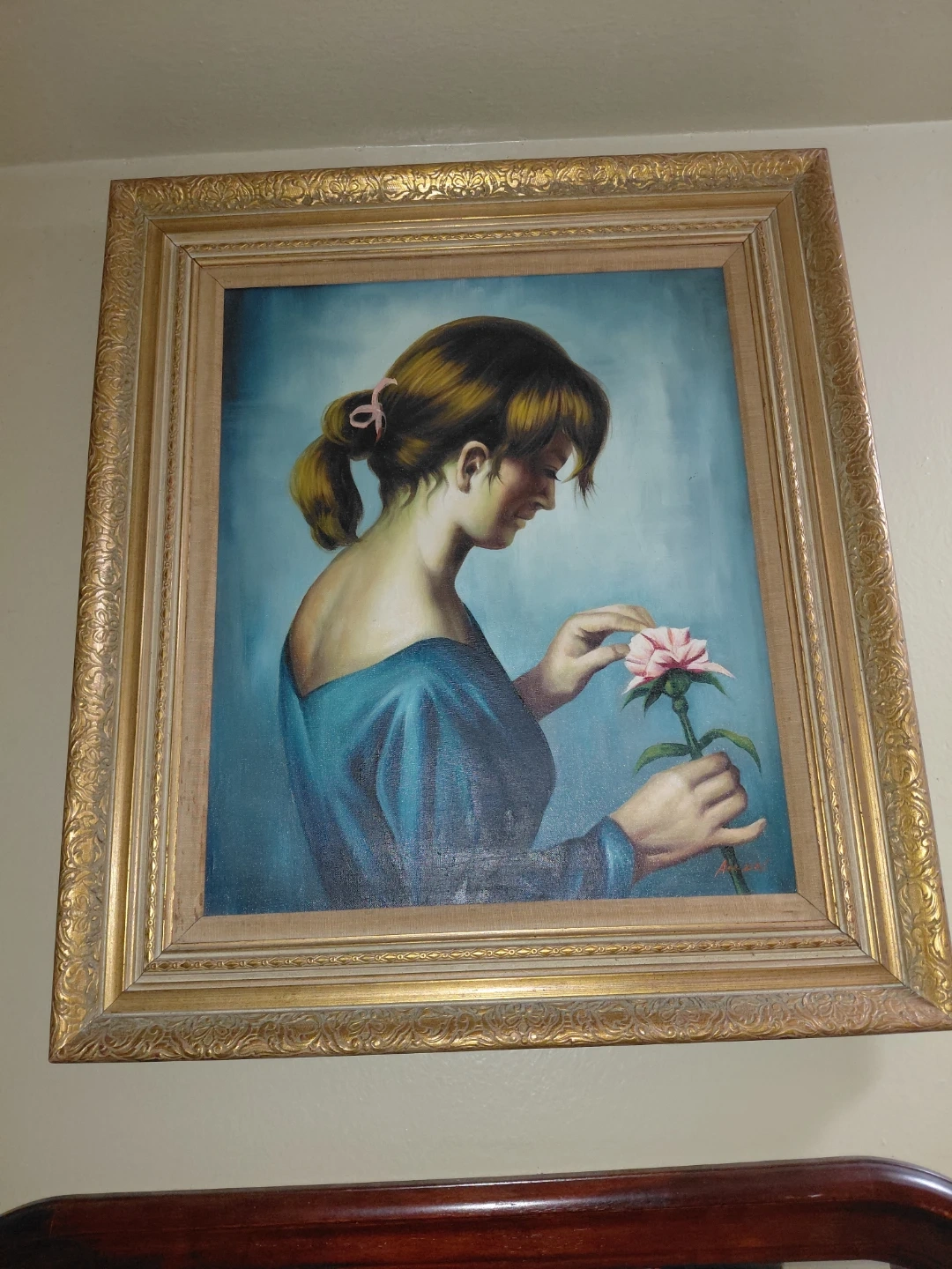 This is an oil painting framed in a gold ornate frame. It depicts a woman with her hair in a ponytail holding a pink flower. The artwork is on canvas with a blue background.