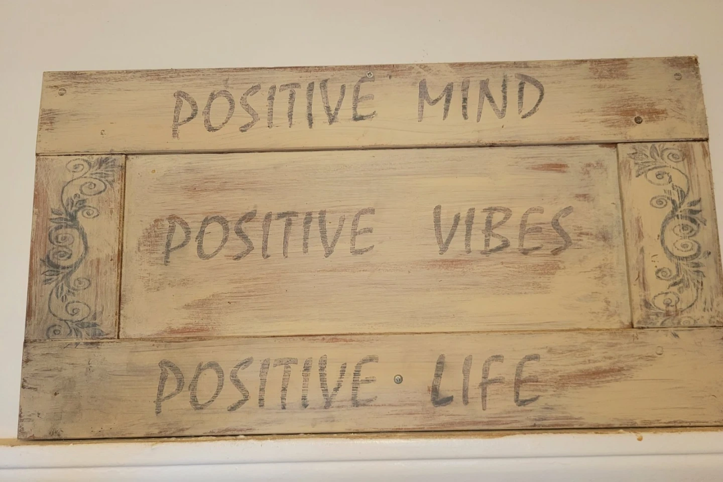 This rustic wooden sign displays "Positive Mind Positive Vibes Positive Life." It's made from distressed wood with a cream-colored base and dark gray lettering. There's also a small hook on the back, possibly for hanging. This sign adds a touch of inspiration to any room!