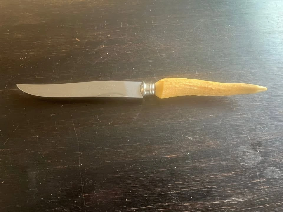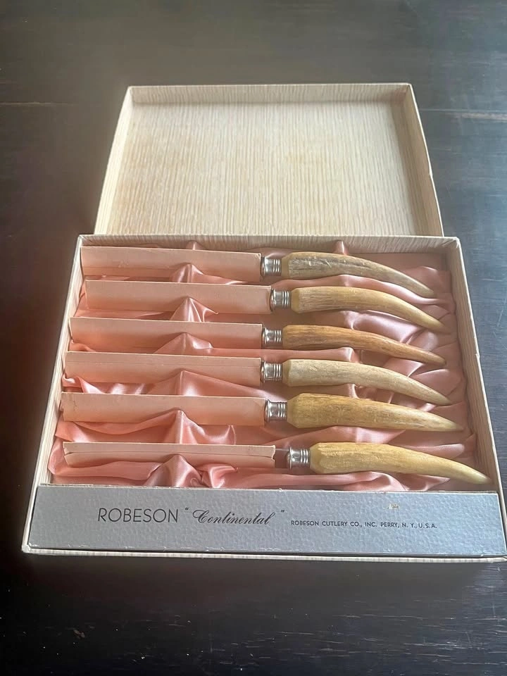 A stunning set of 6 steak knives sure to catch the attention of any place setting. These beautiful Robeson knives were crafted from authentic deer antler tips. A perfect way to add character and interest to your dining room table setting. Made in Germany. These knives have never been used. If this ad is up, they’re available. Located just south of Mt Pleasant and Davisville.