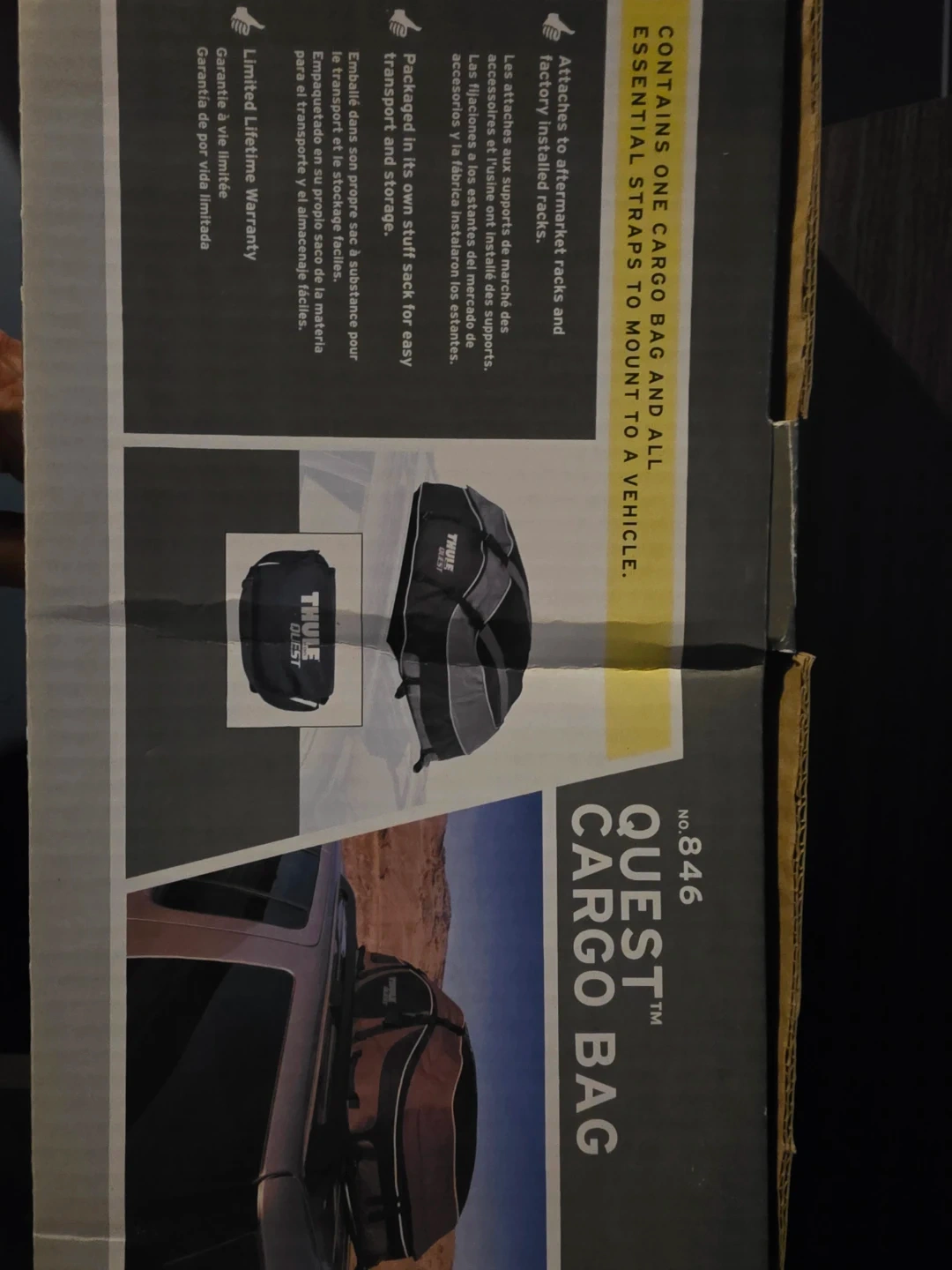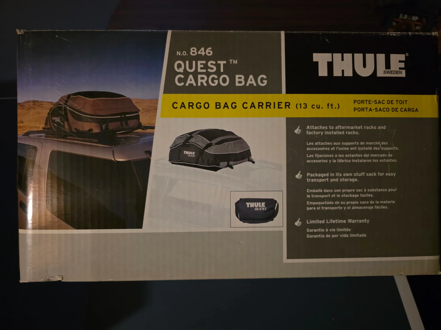 Thule Quest cargo bag rooftop carrier, model N.0. 846. It attaches to aftermarket racks and factory installed racks. Packaged in its own stuff sack for easy transport and storage.