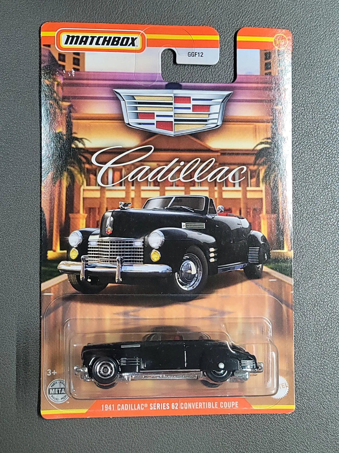 This is a Matchbox die-cast toy car featuring a 1941 Cadillac Series 62 Convertible Coupe. It's black with chrome accents. Recommended for ages 3 and up.