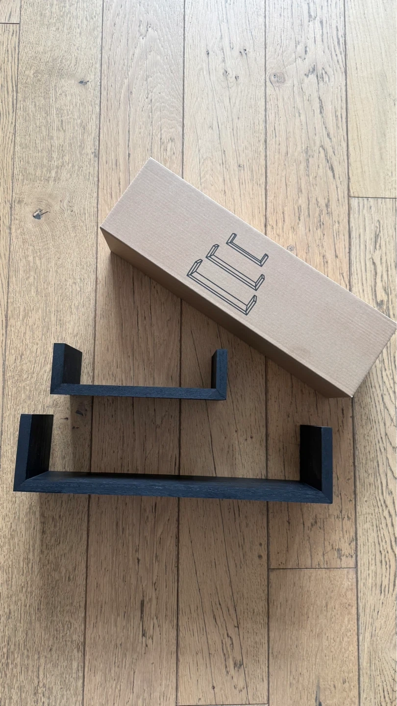 Set of two U-shaped shelves in a black finish. Includes original box. These shelves are great for displaying small items or books!