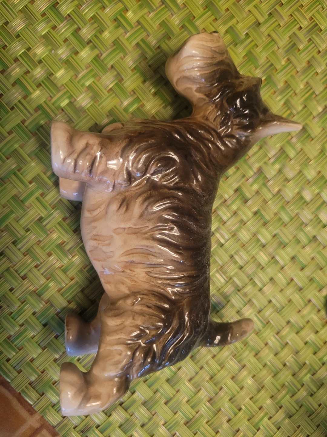 Ceramic figurine of a Scottie dog. It has a glossy finish with brown and cream detailing. This decorative piece would look nice on a shelf or desk.