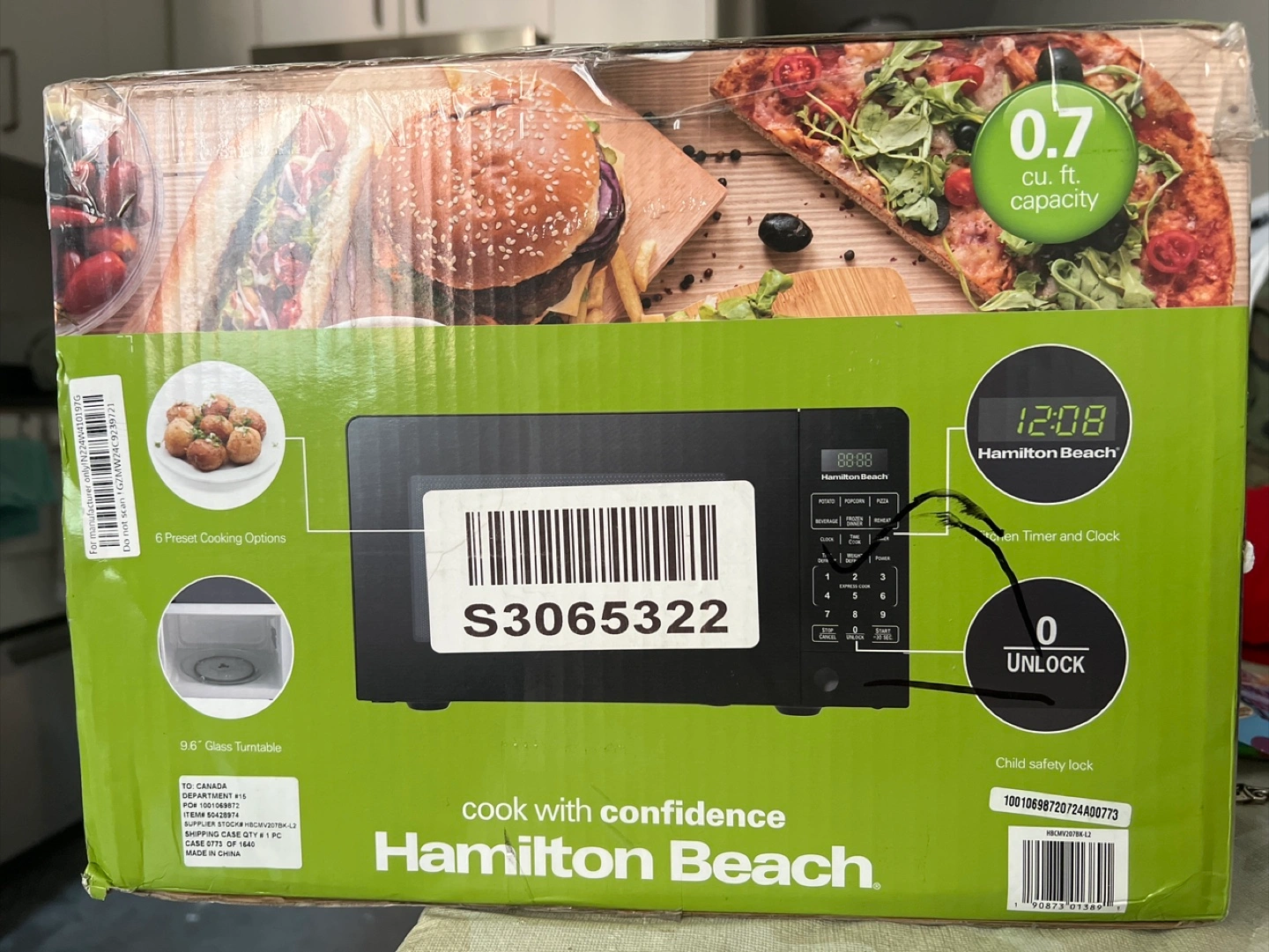 Microwave with a child safety lock. Features preset cooking options. A great addition to any kitchen for effortless cooking.