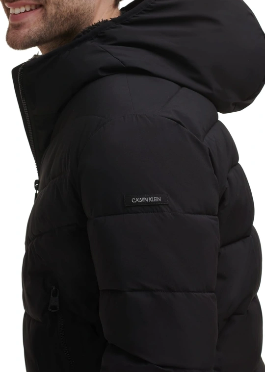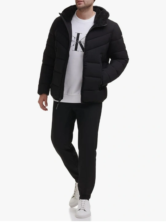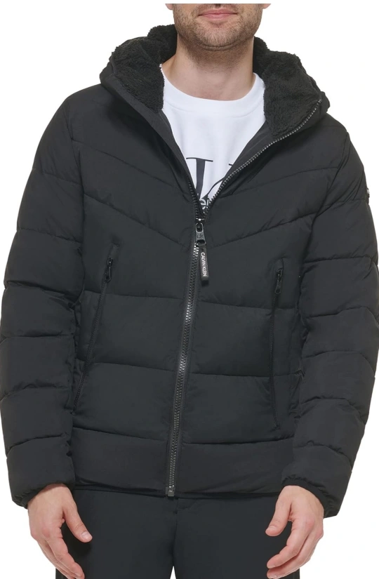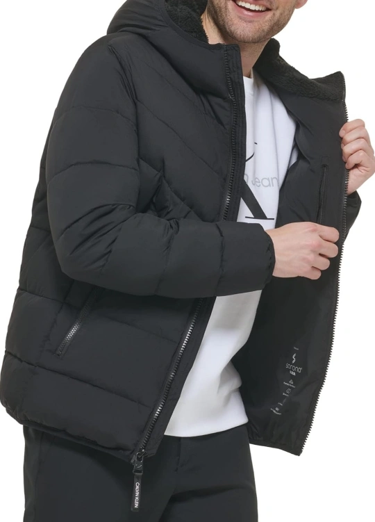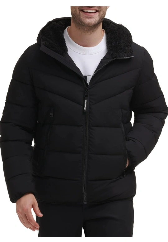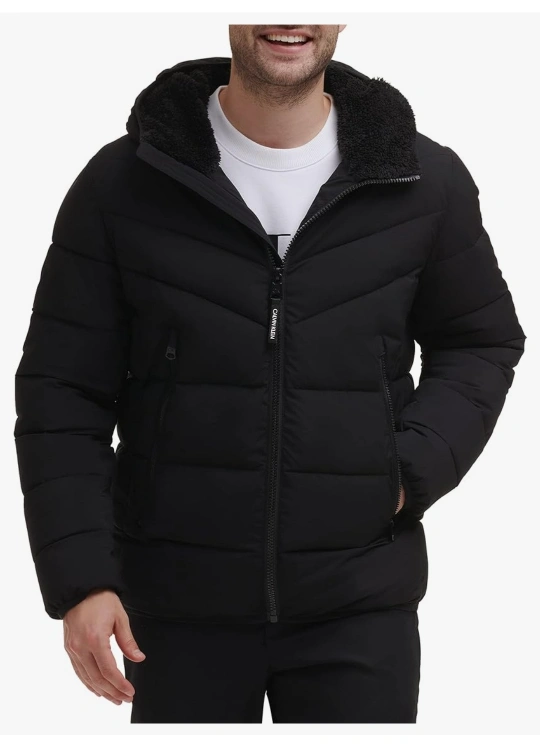 This hooded stretch sherpa-lined puffer jacket combines warmth, function, and a modern design. Perfect for the colder months!