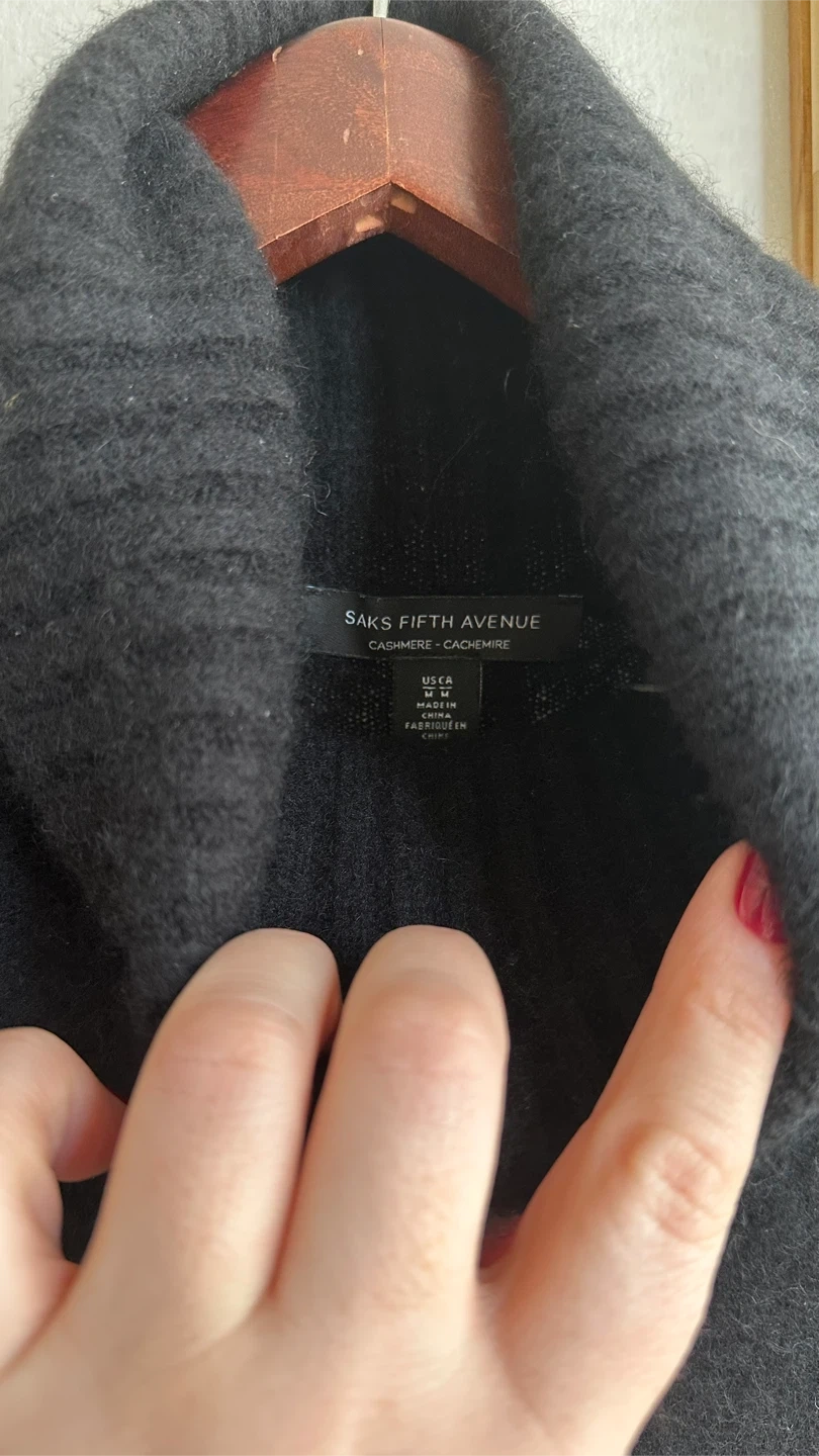 Cozy black turtleneck sweater from Saks Fifth Avenue. It's made of soft cashmere and features a comfortable fit. Size M. Perfect for staying warm in cooler weather!