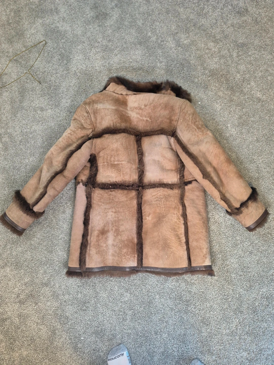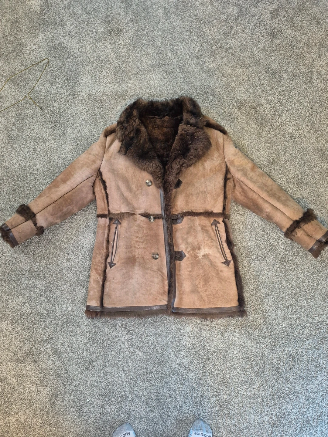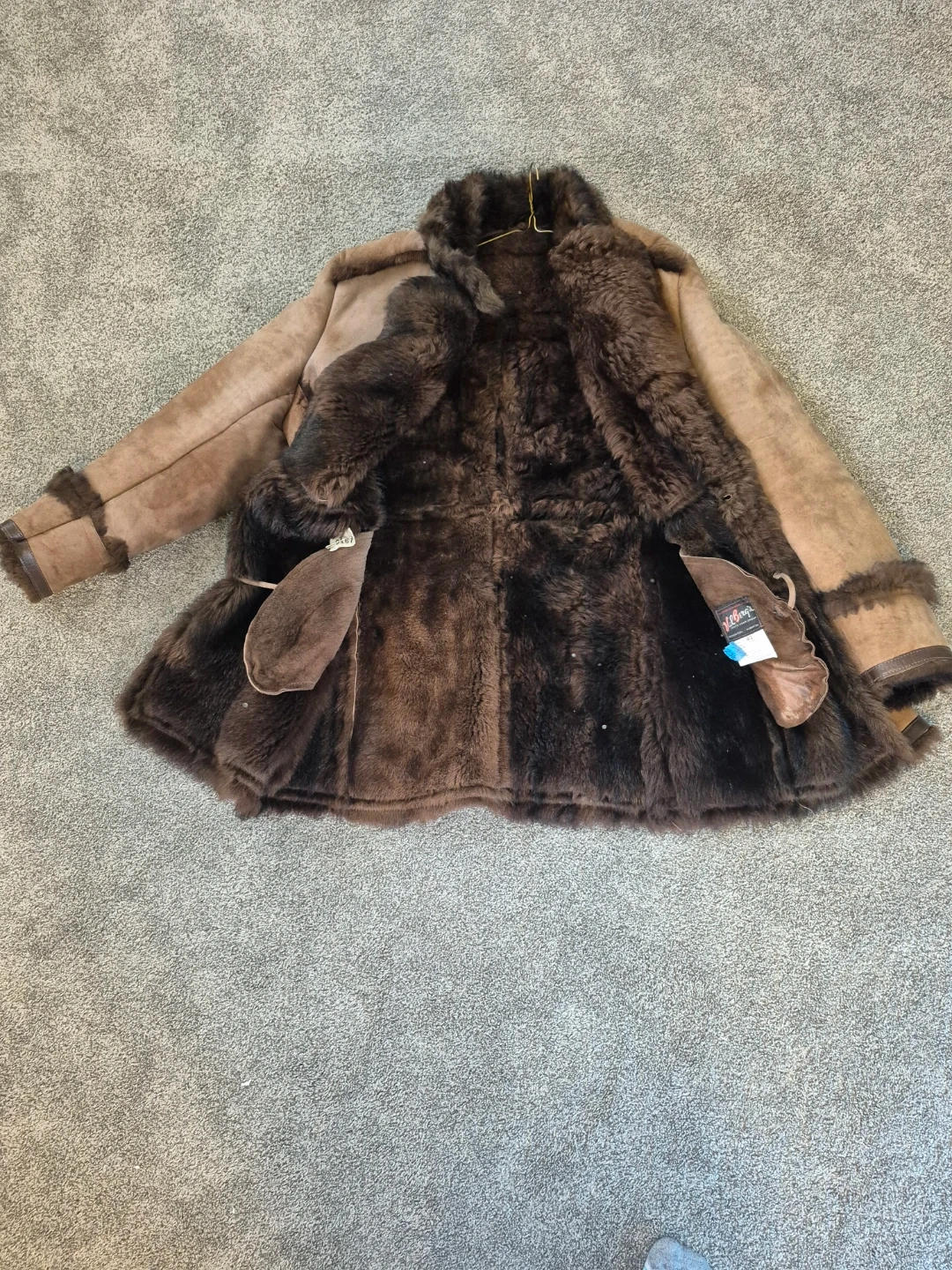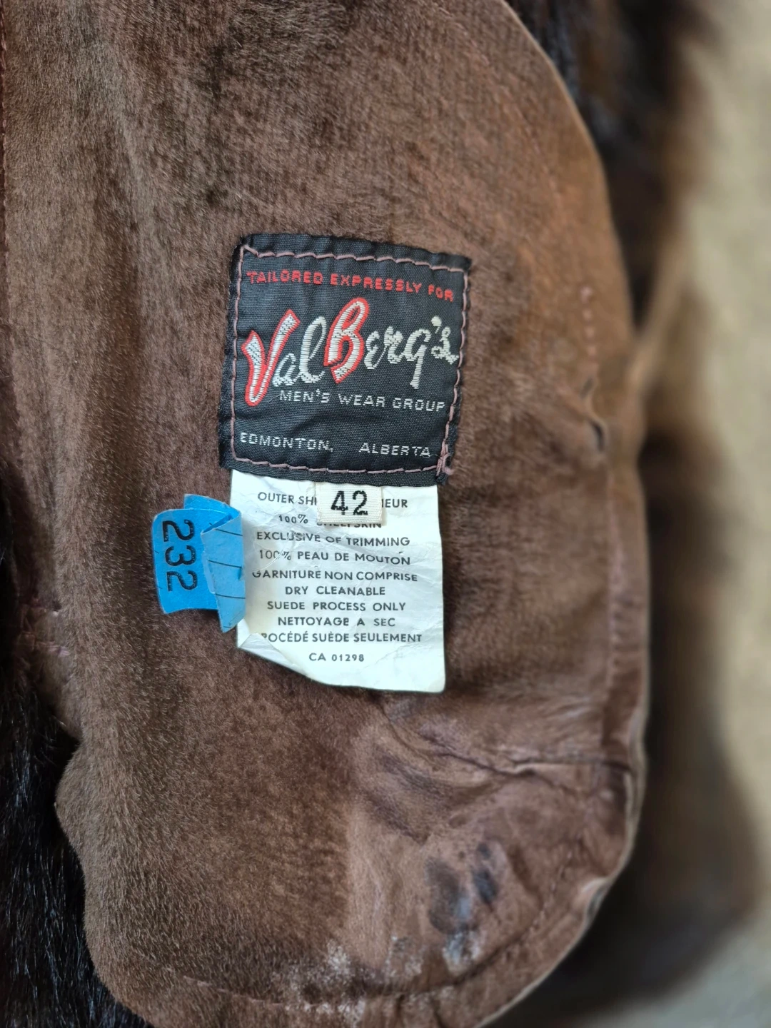 Men's sheepskin coat tailored by Valberg's. This classic coat is made with 100% sheepskin and exclusive trimming. It features a warm, shearling lining and a rich, natural brown colour. This coat is best cared for with a suede process only. It's a size 42 EUR. This is in excellent condition. One owner used rarely.