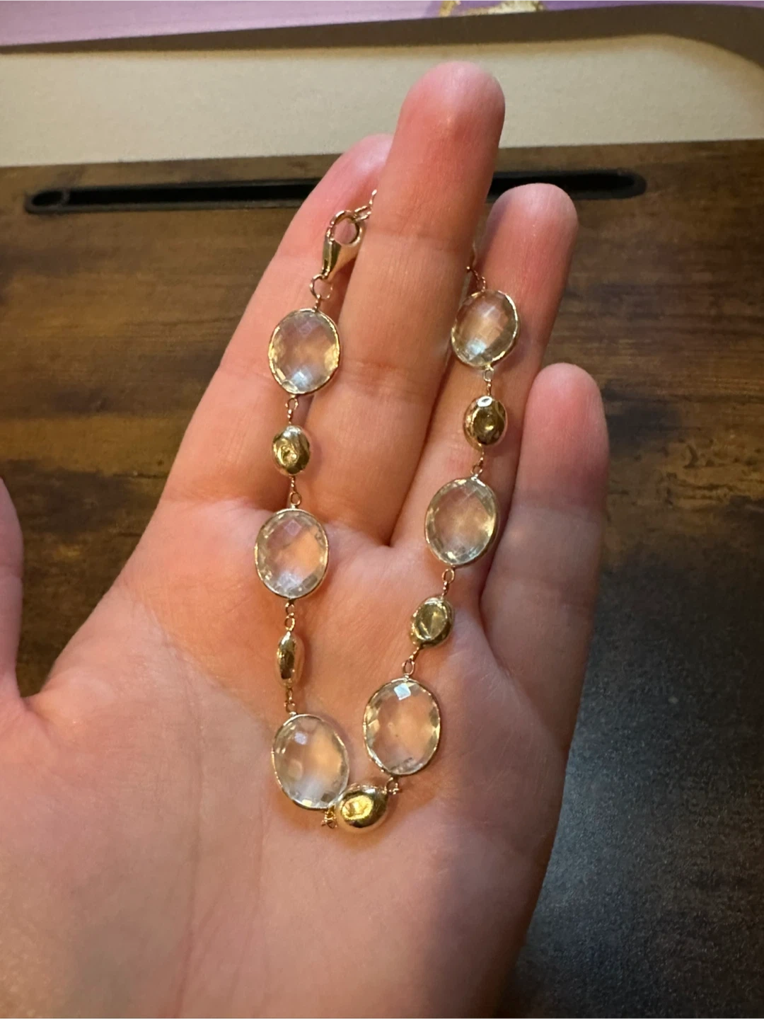 This is a vintage 14k gold bracelet. The gems look clear, but they are a very pale green amethyst. This bracelet was $1000 new 25+ years ago.
