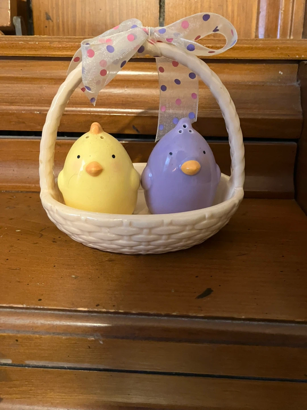 These adorable chick-shaped salt and pepper shakers are a fun addition to any kitchen. The set includes a small woven basket with a polka dot ribbon for display. Ceramic material. Perfect for Easter decor!
