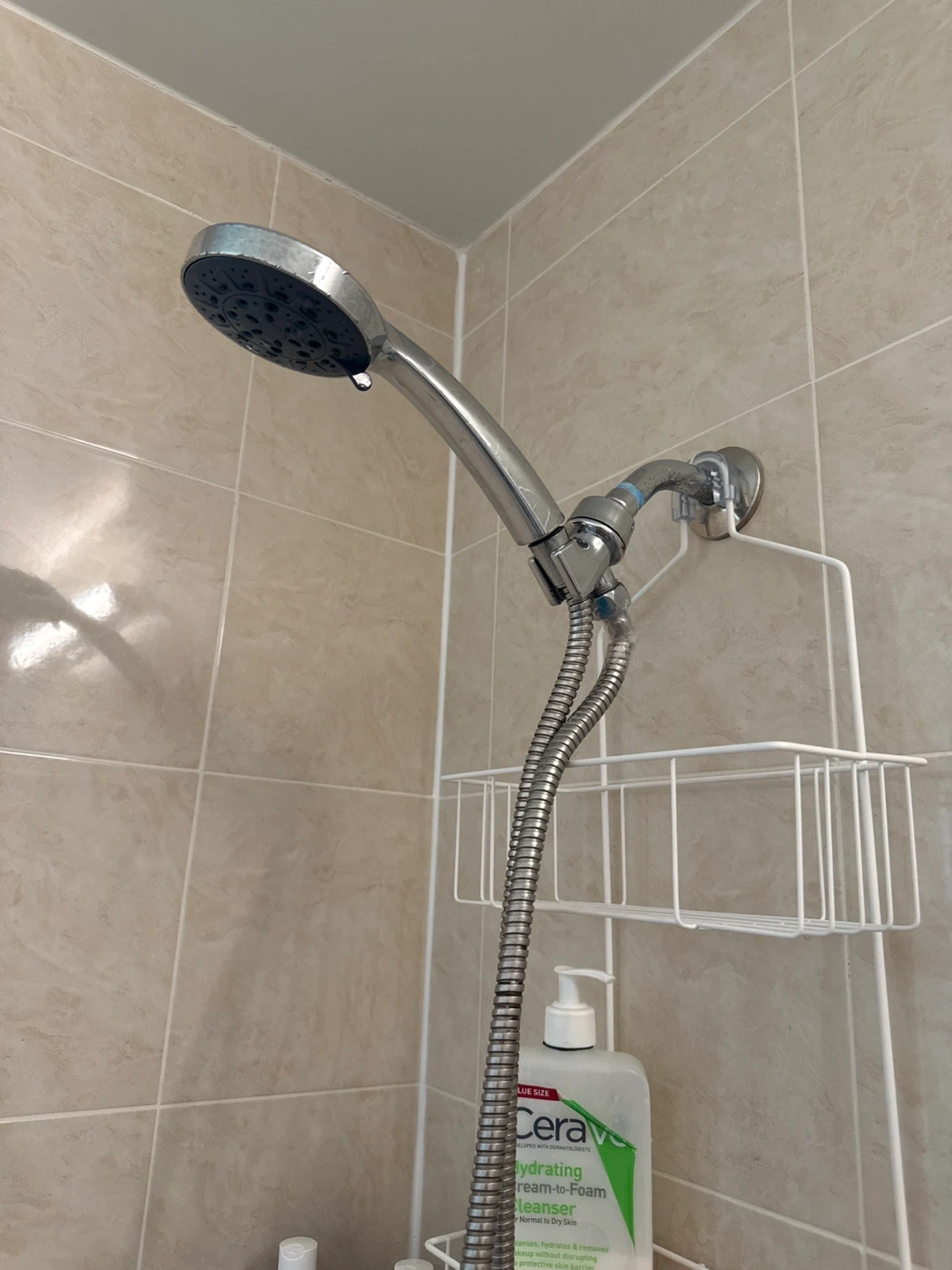 This is a chrome handheld shower head with a flexible hose. It's designed for easy use and installation. The shower head features multiple spray settings for a customizable shower experience. A great addition to any bathroom for added convenience!