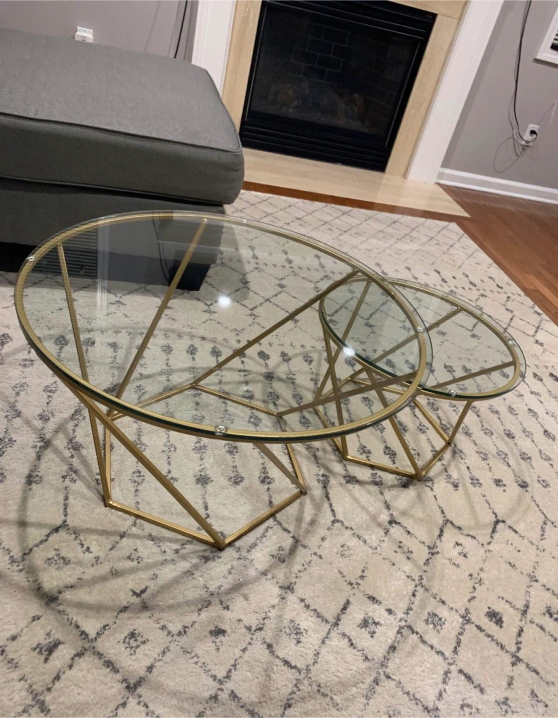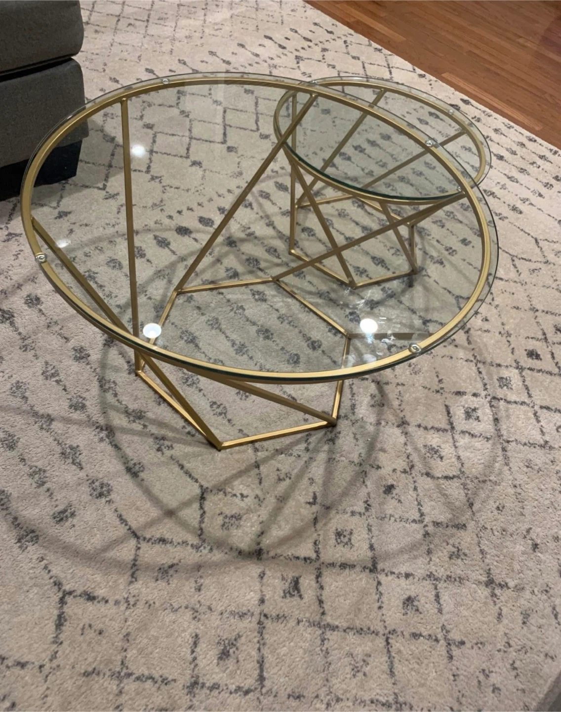 This set includes two round coffee tables. They feature clear glass tops and gold-toned geometric metal bases. One table is larger than the other, designed for nesting. Great for a living room or den!