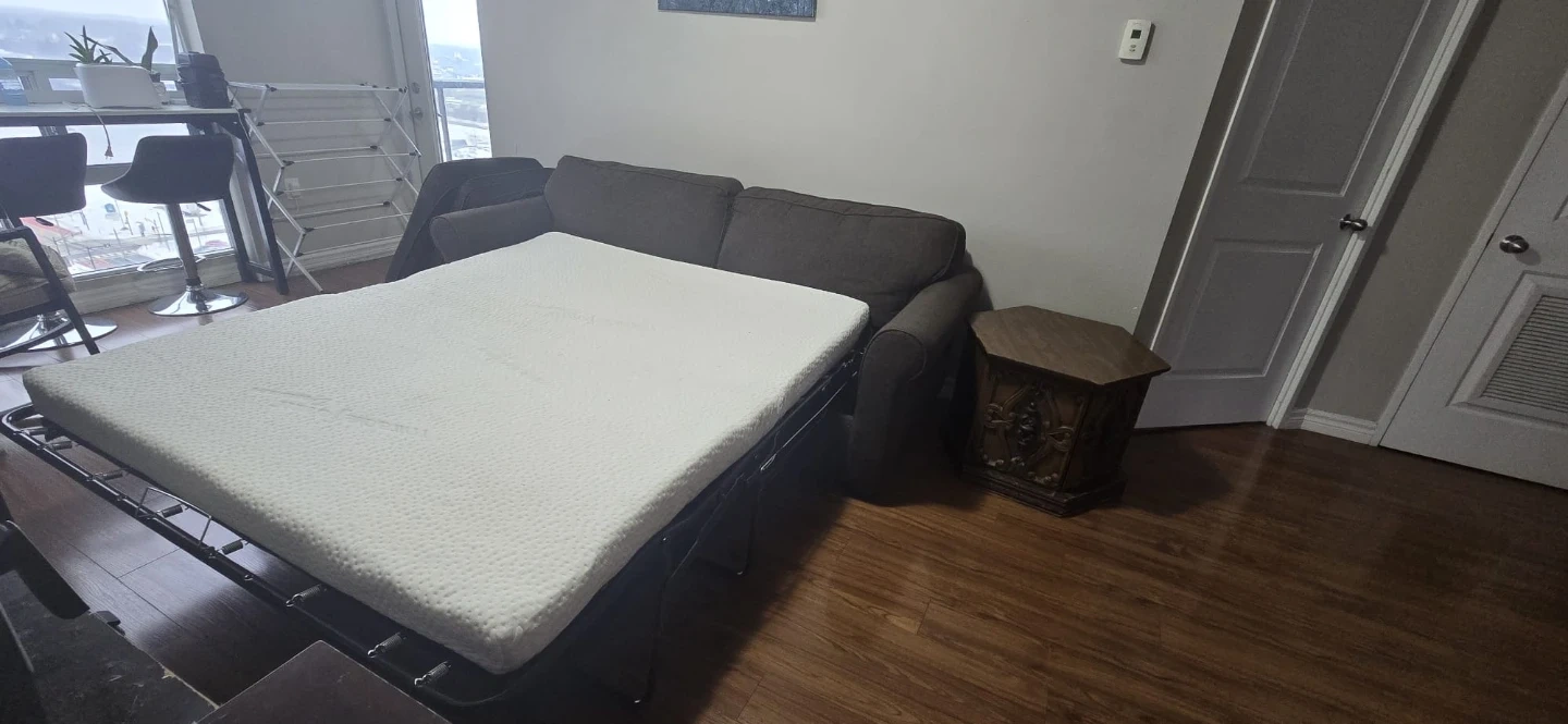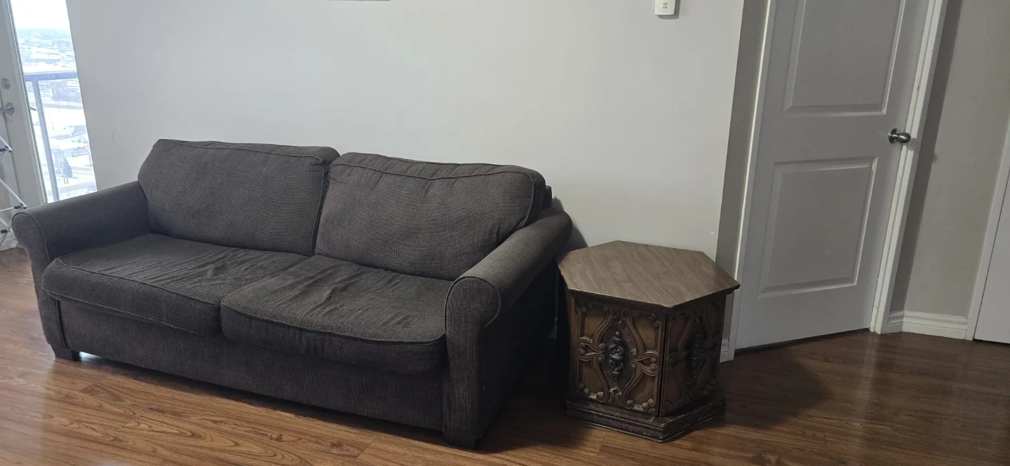 This is a comfortable sofa that easily converts into a bed. The couch fits 3 people comfortably.It's upholstered in a durable, dark brown fabric. The mattress is a clean white, foam material. It's great for accommodating overnight guests!